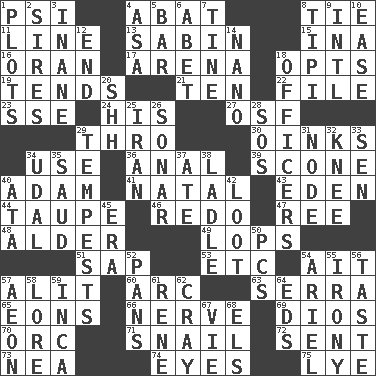 ACROSS 1. 23rd letter of the Greek alphabet 4. Blind as ____ 8. Make a knot 11. Actor's bit 13. Unit of acoustic absorption 15. _ tizzy (2 wds.) 16. NW Algerian seaport 17. Sports stadium 18. Elects 19. Watches over 21. "___ Little Indians" 22. Do some clerical work 23. Compass dir. 24. Part of HMS, perhaps 27. Order of Saint Francis (abbr.) 29. Through, poetically 30. Pig sounds 34. Purpose 36. Of or related to the anus 39. Biscuitlike quick bread 40. First man 41. Brizilian seaport 43. Paradise 44. Grayish beige 46. Make new 47. To riddle 48. Tree or shrub in the Birch family 49. Chops off 51. Plant excrement 53. And so on (abbr.) 54. Small island 57. Came down and settled, as after flight 60. Curve 63. Father Junipero _ 65. Immeasurably long periods of time 66. Effrontery 69. "Vaya con ____" 70. The grampus (Milton) 71. Slow-paced one 72. Emitted 73. Teachers' org. 74. Snake ____ (dice throw) 75. Potassium hydroxide DOWN 1. Schemes 2. Fathers 3. Silly 4. White ___ sheet 5. Soap unit 6. Collude with 7. Prong on a fork 8. Native american tent (variation) 9. International (abbr.) 10. Comfort 12. Conclusion 14. Billionth: prefix 18. Persons of authority 20. Quiet! 25. SW Asia republic 26. Underwater navigation system 28. Mayday 29. Storms 31. Thickened enlargement 32. Leg joint 33. Elected rep. 34. Hereditary estate 35. Saudi Arabian king (1953-1964) 37. Had dinner 38. Dipping utensil 40. _ moment's notice (2 wds.) 42. Plunder 45. Epoch 50. Personal Computers (abbr.) 52. Baking dishes 54. Satellite of Uranus 55. Literary sarcasm 56. Clothes sense 57. Period of immesurable duration 58. Old wives' tales, e.g. 59. South American Indian 61. French philosopher Descartes 62. Supercomputer manufacturer 64. Begley and Asner 67. Compete 68. Raised railways