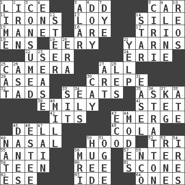 ACROSS 1. Louse (plural) 5. Find the sum of 8. 4-wheeled motor vehicle 11. Removes the wrinkles 13. Myrna of the movies 14. Drop; flow; fall 15. French painter Edouard 16. "We ___ not amused" (Victoria) 17. Musical group of three 18. Followers of ems 19. Suggestive of the supernatural 21. Tall tales 22. One who makes use of a thing 24. One of the Great Lakes 25. Device for capturing images 27. 100% 29. At sea 30. Streamer paper 32. Bits 33. Theater features 35. "____ silly question..." 39. Poet Dickinson 41. Proofreading order 42. It is 43. Develop 45. Small valley 48. Root beer relative 49. Relating to the nose 50. Parka part 52. Three (prefix) 55. Opposed to 56. Java container 57. Keyboard key 59. Adolescent 60. Portuguese money of account (variant) 61. Biscuitlike quick bread 62. Compass dir. 63. Binary compound 64. Washington bills DOWN 1. Welles in "The Third Man" 2. SW Asia republic 3. Eaten 4. Compass dir. 5. Having or resembling wings 6. Small, narrow, flatbottom fishing boat 7. Color 8. High-altitude cloud 9. Place in a line 10. Vintage cars 12. Navigate 14. Play the lead 20. Epoch 21. Sharp bark 23. Gospel singer Marvin 25. Feline 26. White ___ sheet 27. Tate display 28. French article 30. Island 31. Artist's stand 33. Be seated 34. Raised railways 36. Ski resort town in Vermont 37. Cask 38. Had dinner 40. Place where flour is made 43. Environmental prefix 44. Methods 45. Natives or inhabitants of Denmark 46. First name in cosmetics 47. (Had) reclined 49. Nathan's nickname 50. Took on color 51. Double curve, resembling the letter S 53. French philosopher Descartes 54. Angers 56. Medical imaging device (abbr.) 58. Non-commissioned officer (abbr.)
