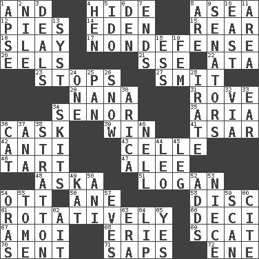 ACROSS 1. Also 4. Flintstone garb 8. Toward the sea 12. Sliced desserts 14. Paradise 15. Stern 16. Kill 17. Unrelated to defense, as in spending 20. Snakelike fish 21. Compass dir. 22. "One Day ___ Time" 23. Halts 27. Stricken, poetically 29. Grandmother 31. Be footloose 34. Sir (Sp.) 35. Roberta Peters solo 36. Keg 39. Acquire through effort 41. Russian ruler of old 42. Opposed to 43. Cell (Danish) 46. Small pie 47. Toward shelter 48. "____ silly question..." 51. Utah city north of Ogden 54. Baseball player Mel 56. One (Scot) 58. Flat circle 61. Rotating or pertaining to rotation 66. Tenth: prefix 67. Mine, in Marseilles 68. One of the Great Lakes 69. Leave at once 70. Transmitted 71. Plant excrements 72. Compass dir. DOWN 1. Domed church section 2. The longest river in the world 3. Allots cards 4. Layer 5. Wedding promise 6. Lair 7. Conclusions 8. "We ___ not amused" (Victoria) 9. Legislators 10. 90 degrees 11. Type of rug 13. System (abbr.) 18. Double-curved letter 19. Opposite of masc. 24. Single 25. Baking dish 26. Frozen precipitation 28. Feeling or showing extreme anger 30. N. Chile seaport 32. By way of 33. Ewer handle 34. Burlesque acts 36. Feline 37. Santa ___, CA 38. Ski resort town in Vermont 40. 1994 drama film starring Jodie Foster 44. Lion 45. Part of a journey 49. Krazy ___ of comics 50. Cuckoo 52. Does sums 53. Sibling's daughter 54. Mouths or openings 55. Heavy book 57. Nights before holidays 59. Skim 60. Quote 62. Small island 63. Period 64. Mouth edge 65. Consenting reply