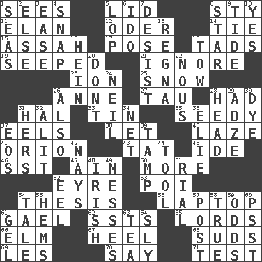 ACROSS 1. Perceives with the eye 5. Flaplike covering 8. Filthy place 11. Style 12. Baltic tributary 14. Make a knot 15. Indian state 17. Airs 18. Small boys 19. Oozed 21. Refuse to acknowledge 23. Electrically charged atom 25. Overwhelm 26. Singer Murray 27. The 19th letter of the Greek alphabet 28. Possessed 31. Actor Linden 33. Shallow baking pan 35. Shabby and untidy 37. Snakelike fish 38. Allow 40. Goldbrick 41. Greek mythologigal hunter 43. Make lace 45. Binary compound 46. Fast jet (abbr.) 47. Direct toward a target or goal 50. Greater amount 52. Jane of fiction 53. Luau course 54. College paper 56. Portable computer 61. Highlander 62. Fast planes 65. Titled peers of a realm 66. Shade tree 67. Person who is morally reprehensible 68. Beer foam 69. French article 70. Declare 71. Trial DOWN 1. Oceans 2. Otherwise 3. Relaxation 4. Fastener 5. Chop off 6. Wedding promise 7. Cease 8. Play the lead 9. Periodic rise and fall of the sea level 10. Affirmative reply 13. Rain (Swedish) 16. Count _ (2 wds.) 18. Pull behind 20. Do not 22. Common sense 24. Famous astronaut Armstrong 26. In addition 28. Froth on beer 29. Edge tool used to cut and shape wood 30. Color 31. Possessive pronoun 32. Came down and settled, as after flight 34. Fish or hair follower 36. Writer Wiesel 37. Greek goddess of the dawn 39. Pack (down) 42. Negative votes 44. Implement 48. From or relating to Ireland 49. Makes clutter 51. Monetary unit of Yemen 52. Snakelike fish 54. Story 55. Equivocates 57. Mail 58. Loyal 59. Probability 60. Inconspicuous attention getter 61. Set 63. Beverage made from leaves 64. Stealthy