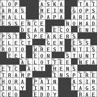 ACROSS 1. Trim (branches) 4. "____ silly question..." 8. Make lace 11. Caspian sea tributary 13. Chow _ 14. Republicans 15. Shopping center 16. Dad 17. Operatic vocal solo 18. Gist 21. Roamer 22. Letter starter 23. Environmental prefix 25. Compass dir. 26. Pacific Standard Time (abbr.) 29. Orators 32. Opt 34. Commissioned mil. rank 35. Double-curved letter 38. Printing process, for short 39. Obtain by seizing forcibly or violently 41. Nuclear Threat Initiatives 43. Snakelike fish 44. Period of immesurable duration 45. Difficult or unusual or dangerous feat 46. One to whom something is allotted 50. Teachers' org. 51. And so on (abbr.) 54. Keyboard modifier key 55. Coop moms 57. _____ steamer (cargo ship) 59. Stimulate to action 63. Israeli folk dance 64. Ache 67. SW Saudi Arabia district 68. In an inward manner 69. International (abbr.) 70. Labels 71. Corporate head (abbr.) 72. Whirlpool 73. Actress Charlotte DOWN 1. Unable to walk 2. Mouths or openings 3. Friends 4. Electrical Unit 5. Ocean 6. Sleep 7. Santa ___, CA 8. Singer Mel 9. Bee-related 10. Sadhe (variant) 12. Downhill vehicle 14. E Mali city 19. Egg locale 20. Head covering 21. And not 23. Supplements with great effort 24. Penny 26. For each 27. _ gin 28. False hair 30. Representative 31. Transmitted 33. Root beer relative 36. Make senseless or dizzy 37. Trig term 39. Not ill 40. Carrot, for example 42. R.R. building 45. Elected reps. 47. Infant locale 48. Without viscosity 49. Car or cant ending 51. Value system 52. Marketplace scale 53. Monte _, Las Vegas Hotel/Casino 56. Petty quarrel 58. Fifth month 60. Austrian river, tributary to the Danube 61. Port city in Latvia 62. Celtic language 64. Sliced dessert 65. Plus 66. It would