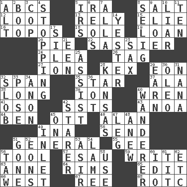 ACROSS 1. Lettered men learn these first 5. Lyricist Gershwin 8. Table seasoning 12. Plunder 13. Have confidence or faith in 15. Writer Wiesel 16. Literary convention 18. Not divided or shared with others 19. Grant temporary use of 20. Sliced dessert 22. More disrespectful 24. Entreaty 26. Label 27. Charged particles 28. Dry husk or covering 29. Period of immesurable duration 32. Connect, as a bridge 35. Play the lead 37. According to 38. Yearn 39. Electrically charged atom 40. Songbird 41. Bear (Spanish) 42. Fast planes 43. Small Philippine buffalo 44. Benjamin's nick name 45. Baseball player Mel 46. ____ Jay Lerner 49. _ tizzy (2 wds.) 50. Transmit 51. Commissioned military rank 55. Unit of force equal to gravity 56. Instrument 57. He sold his birthright 59. Compose 63. Singer Murray 64. Basketball hoops 65. Prepare for publication 66. 270 degrees 67. To sift 68. College mil. group DOWN 1. The first octave above the treble staff 2. Oct. 31 cry 3. Police officer (slang) 4. Constricting 5. Big collection agency 6. Vintage cars 7. Silent film actress Nazimova 8. Major League Baseball Commissioner Bud 9. _ vera 10. One who doesn't tell the truth 11. Nine, plus one 14. Last 17. Grain storage tower 21. Car or cant ending 23. Saxophone 25. Help 28. Sunflower state 29. Merit 30. Butter sub 31. Nanny 32. Oscar Madison type 33. Airs 34. At once, immediately (arch.) 36. Small child 40. Nomad 42. A viewer who gazes fixedly 45. Single 47. Part of a journey 48. Afresh 49. An arm off of a larger body of water 51. Went 52. Immeasurably long periods of time 53. SW Saudi Arabia district 54. Unable to walk 56. The 23rd letter of the Hebrew alphabet 58. Purpose 60. Wedding promise 61. Teat (slang) 62. And so on (abbr.)