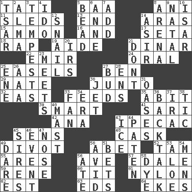 ACROSS 1. Jacques of French films 5. Sound made by sheep 8. Black tropical American cuckoo 11. Bobsleighs 13. Conclusion 14. Ancient river in northeast Turkey 15. ID or VA city 16. Added to 17. Stalk of a moss capsule 18. Hit sharply and swiftly 19. Assistant 21. Middle Eastern gold or silver currency 22. Independent ruler or chieftain 24. Of the mouth 25. Artist's stands 27. Benjamin's nick name 29. Nathan's nickname 30. Secret group 32. 90 degrees 33. Eats 35. "This won't hurt ____!" 39. Don Adams' spy role 41. Indian skirt 42. Santa ___, CA 43. Medicinal drug used to evoke vomiting 45. Elected reps. 48. Keg 49. A piece of turf (Scot.) 50. Collude with 52. Scottish cap 55. Ancient Greek god of war 56. "___ Maria" 57. Peak District village in England 59. French philosopher Descartes 60. Teat (slang) 61. Thermoplastic polyamide 62. Eastern Standard Time (abbr.) 63. Begley and Asner 64. Makes supply last DOWN 1. Russian ruler of old 2. _ mater 3. Storms 4. Wedding promise 5. Necklace unit 6. Queen of England 1702-14 7. Find the sum of 8. Sports stadium 9. Relating to or accompanying birth 10. Austrian river, tributary to the Danube 12. Slow-paced one 14. SW Saudi Arabia district 20. Big collection agency 21. Do not 23. Confronts 25. Compass dir. 26. Auto club (abbr.) 27. Partially opened flower 28. Followers of ems 30. Passenger plane 31. Fertile tracts in a desert 33. Air blower 34. Period 36. Sass 37. Retirement account (abbr.) 38. Nervous spasm 40. Vertical spar for supporting sails 43. Frozen water 44. Eucharist need 45. Titles for men of rank and authority 46. Incident 47. Sense of smell 49. Have the gumption 50. Enthusiastic 51. Wagers 53. _ vera 54. Not women's 56. Had dinner 58. Color