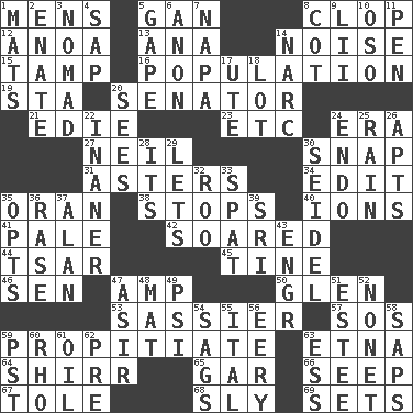ACROSS 1. Not women's 5. Separate the seeds from cotton 8. Hoof sound 12. Small Philippine buffalo 13. Santa ___, CA 14. Annoying sound 15. Pack (down) 16. Census information 19. R.R. building 20. Legislator 21. Singer Brickell 23. And so on (abbr.) 24. Epoch 27. Famous astronaut Armstrong 30. Fastener 31. Michaelmas daisies 34. Prepare for publication 35. NW Algerian seaport 38. Closes up, plugs up 40. Charged atoms 41. Light colored 42. Flew 44. Russian ruler of old 45. Prong on a fork 46. Elected rep. 47. Electrical Unit 50. Small, secluded valley 53. More disrespectful 57. Mayday 59. Conciliate 63. Inactive volcano in Sicily 64. Bake eggs in their shells 65. Slender fish 66. Ooze 67. Lacquered or enameled metalware 68. Cunning 69. Puts into a specified state DOWN 1. Floor protectors 2. Related on the mother's side 3. Roamer 4. Plant excrement 5. Stare wonderingly 6. At once, immediately (arch.) 7. California wine valley 8. Small bed 9. Cards in a Roman deck? 10. Bear (Spanish) 11. Fenced enclosure 14. Drug cop 17. Shoshoni 18. Car dealer's back yard 20. Observes 22. More lacking in sense or substance 24. Inside; within (prefix) 25. Water falling in drops from the sky 26. Tenement units (abbr.) 28. It is 29. Allows 30. Beer mug 32. Friend of Pooh 33. Petty quarrel 35. Chooses 36. Raze (variant) 37. ____ Jay Lerner 39. _ Lanka 43. Engineer (abbr.) 47. SW Saudi Arabia district 48. Floor protector 49. 23rd letter of the Greek alphabet 51. First name in cosmetics 52. Music written for nine 54. Droops 55. Slanted text style (abbr.) 56. Suggestive of the supernatural 58. Plant excrements 59. Pacific Standard Time (abbr.) 60. 17th letter of the Greek alphabet 61. Petroleum 62. Before (prefix) 63. Curvy letter