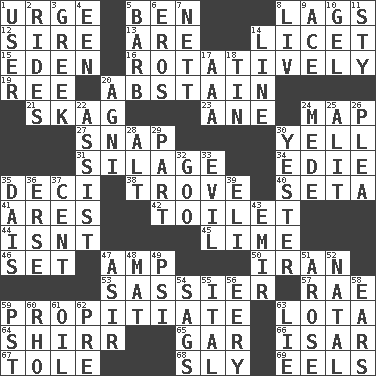 ACROSS 1. Goad 5. Benjamin's nick name 8. Straggles 12. Title for a man of rank and authority 13. "We ___ not amused" (Victoria) 14. It is permitted: Lat. 15. Paradise 16. Rotating or pertaining to rotation 19. To separate or throw off 20. Choose not to consume 21. Heroin 23. One (Scot) 24. Atlas unit 27. Fastener 30. Shout 31. Fodder prepared in a silo 34. Singer Brickell 35. Tenth: prefix 38. Collection of objects 40. Stalk of a moss capsule 41. Ancient Greek god of war 42. Bathroom plumbing fixture 44. Is not 45. Welles in "The Third Man" 46. Arrange properly for use 47. Electrical Unit 50. SW Asia republic 53. More lively and spirited 57. Actress Charlotte 59. Appease 63. Globular water bottle used in Asia 64. Bake eggs in their shells 65. Slender fish 66. Austrian river, tributary to the Danube 67. Lacquered or enameled metalware 68. Roguish 69. Snakelike fish DOWN 1. One who uses or employs something 2. Amusement-park features 3. Of Greece 4. Car or cant ending 5. Sharp remark 6. Greek god of love 7. Remaining after all deductions 8. 54 in ancient Rome 9. Adept person 10. Set 11. Filthy place 14. Actor's bit 17. Auto club (abbr.) 18. Metal container 20. Hindu god of fire 22. Aid 24. Ancient Persian 25. Came down and settled, as after flight 26. Entreaty 28. The first octave above the treble staff 29. Role in a play 30. Of or pertaining to yesterday 32. Thick or sticky substance 33. Tending to cause great harm 35. Raised platform 36. Celtic language 37. Penny 39. Biblical high priest 43. Arab leader 47. SW Saudi Arabia district 48. Floor covering 49. Air pressure measure (abbr.) 51. Came up 52. Brizilian seaport 54. Droops 55. Slanted text style (abbr.) 56. Suggestive of the supernatural 58. Hearing organs 59. Pacific Standard Time (abbr.) 60. 17th letter of the Greek alphabet 61. Petroleum 62. Before (prefix) 63. Falsehood