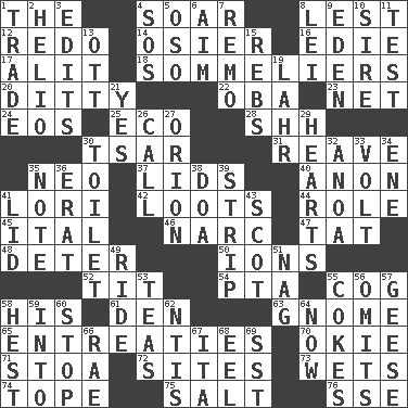 ACROSS 1. Definite Article 4. Fly high 8. For fear that 12. Do over again 14. Flexible twig of a willow tree 16. Singer Brickell 17. Came down and settled, as after flight 18. Wine waiters 20. Short, simple song 22. Chief or king in Benin or Nigeria 23. Fish or hair follower 24. Greek goddess of the dawn 25. Environmental prefix 28. Quiet! 30. Russian ruler of old 31. Rob, plunder, or pillage 35. Modern: prefix 37. Flaplike coverings 40. At once, immediately (arch.) 41. Australian parrot (variant) 42. Plunders 44. Hero or heavy, e.g. 45. Slanted text style (abbr.) 46. Drug cop 47. Make lace 48. Prevent from occurring 50. Charged particles 52. Teat (slang) 54. Parent Teacher Assoc. 55. Gear tooth 58. Part of HMS, perhaps 61. Lair 63. Dwarf 65. Pleas 70. Migrant worker of the '30s 71. Portico 72. Settings 73. Soaks 74. Drink excessively 75. Table seasoning 76. Compass dir. DOWN 1. Swap 2. Sun: prefix 3. Prepares for publication 4. Mayday 5. Bear (Spanish) 6. Direct toward a target or goal 7. San ____ (Riviera town) 8. Flowery wreath 9. Genesis locale 10. The founder of a family 11. Trial 13. Baseball player Mel 15. Confederate soldiers (slang) 19. Cowardly lion portrayer 21. It is so 26. Give a ring to 27. Greek mythologigal hunter 29. Centers of feelings and intuitions 30. Bathroom plumbing fixture 32. Small Philippine buffalo 33. Electrical Unit 34. Compass dir. 35. Musical sound 36. Part of Q.E.F. 38. ___ good deed 39. Long narrow piece of something 41. Hat (slang) 43. Highlander 49. Travel on an animal 51. Tired old horse 53. Beverages made from leaves 55. Popular sodas 56. Leaves out 57. Honkers 58. Behest 59. To the inside or interior of 60. Constrict 62. Nuclear Threat Initiatives 64. Immediately 66. Actress Charlotte 67. Call ___ day 68. Snakelike fish 69. Fast jet (abbr.)
