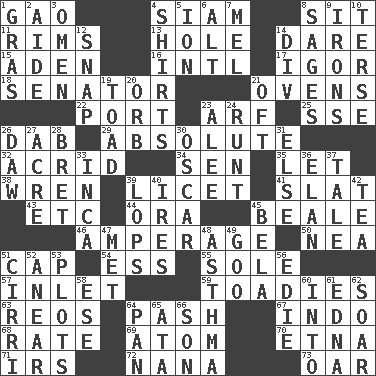 ACROSS 1. E Mali city 4. Thailand, formerly 8. Be seated 11. Basketball hoops 13. Hollow 14. Have the gumption 15. An important port of Yemen 16. International (abbr.) 17. Russian composer Stravinsky 18. Legislator 21. Baking chambers 22. Sweet dark-red dessert wine 23. Sandy's bark 25. Compass dir. 26. Apply (a substance) by light strokes 29. Utter; complete 32. Sour-tasting 34. Elected rep. 35. Allow 38. Songbird 39. It is permitted: Lat. 41. Narrow board 43. And so on (abbr.) 44. Mouth or opening 45. Memphis, Tenn. Street 46. Electrical Measurement 50. Teachers' org. 51. Head covering 54. Curvy letter 55. Flatfish 57. An arm off of a larger body of water 59. Sycophants 63. Vintage cars 64. Romantic infatuation 67. Southeast Asian peninsula 68. Assign a rank or rating to 69. Tiny particle 70. Inactive volcano in Sicily 71. Big collection agency 72. Grandmother 73. Rowing implement DOWN 1. Pate de foie ____ 2. Helper 3. Sign of something about to happen 4. Upper-body garments 5. Electrically charged atom 6. The first octave above the treble staff 7. Cartoonist voice _ Blanc 8. Gurus 9. Metal shackles 10. Laconic 12. Fastener 14. HTML Container Element 19. Frog relative 20. Globe 21. Often (poetically) 23. Toward shelter 24. Undersized animal 26. Obsolete 27. Land measure 28. Cy Young winner Saberhagen 30. Motion picture award 31. Otherwise 33. South American Indian 36. Flair 37. Story 39. Chops off 40. Angers 42. Beverage made from leaves 45. Actor Lugosi 47. Was introduced to 48. Respiratory problem 49. Thick or sticky substance 51. High-altitude cloud 52. Approach 53. Ground plans 56. Singer Brickell 58. Compass dir. 60. To the inside or interior of 61. Pulitzer Prize-winning author Ferber 62. Fly high 64. Baking dish 65. "One Day ___ Time" 66. Manchild
