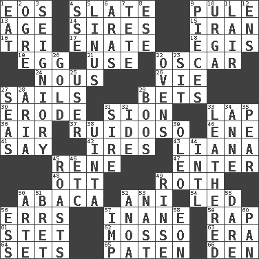 ACROSS 1. Greek goddess of the dawn 4. Schedule 9. Whine 13. Grow older 14. Begets 15. SW Asia republic 16. Three (prefix) 17. Related on the mother's side 18. The front part of a cuirass 19. Oval reproductive body of a fowl 21. Purpose 22. Witty Wilde 24. Good sense 26. Compete 27. Travel by water 29. Wagers 30. Wear away 31. The Jewish people; Israel 33. Infant locale 36. Wind 37. Noisy, rowdy, vocal (Spanish) 40. Compass dir. 41. Declare 42. Angers 43. Woody, climbing, usually tropical plant 45. French philosopher Descartes 47. Keyboard key 48. Baseball player Mel 49. Writer of Portnoy's Complaint (1969) 50. Phillipine bananalike plant 52. Cuckoo 54. Directed 56. Blunders 57. Silly 59. Reproach for some lapse or misdeed 61. Proofreading order 62. With motion or animation 63. Period 64. Puts into a specified state 65. Eucharist need 66. Lair DOWN 1. Ingest 2. Legendary monster 3. Signiory (variant) 4. Compass dir. 5. "_ and Lucy" (Charlie Brown theme song) 6. Ancient river in northeast Turkey 7. Wig 8. Compass dir. 9. Parts 10. Capital and largest city of Mongolia 11. Den 12. Followers of ems 20. Aureate 22. Baking chambers 23. Be seated 25. One who makes use of a thing 27. Oceans 28. Operatic vocal solo 29. Expressions of contempt or scorn 31. Father 32. Binary compound 33. Resembling or made to resemble leather 34. Singer Murray 35. Lightbulb-shaped fruit 38. National forest in Provo, Utah 39. Margarine 44. International (abbr.) 45. Cooks with dry heat, as in an oven 46. And so on (abbr.) 49. Remove soap 50. Johnson of "Laugh-In" 51. Cy Young winner Saberhagen 52. Small Philippine buffalo 53. Political cartoonist Thomas 55. Have the gumption 56. Double-curved letter 57. Mischievous child 58. A really long time 60. Baking dish