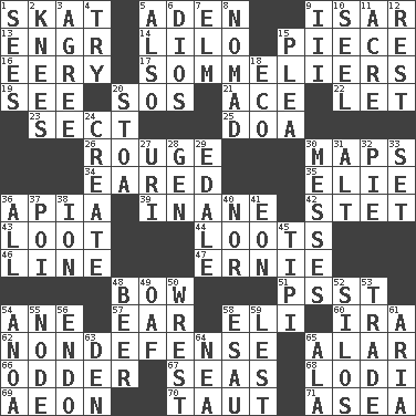ACROSS 1. Three-handed card game 5. Arabian gulf 9. Austrian river, tributary to the Danube 13. Engineer (abbr.) 14. _ and Stitch 15. Part 16. Suggestive of the supernatural 17. Wine waiters 19. Observe 20. Distress signal 21. Adept person 22. Allow 23. Religious group 25. ___ good deed 26. Makeup applied to the cheeks 30. Atlas contents 34. Having ears or earlike features 35. Writer Wiesel 36. Capital of Western Samoa 39. Empty; void 42. Proofreading order 43. Spoils 44. Plunders 46. Actor's bit 47. Bert's buddy 48. Arrow shooter 51. Inconspicuous attention getter 54. One (Scot) 57. Ewer handle 58. Connecticut Ivy Leaguer 60. Lyricist Gershwin 62. Unrelated to defense, as in spending 65. Having or resembling wings 66. More peculiar 67. Oceans 68. Farming town in central California 69. Period of immesurable duration 70. Tense 71. Toward the sea DOWN 1. Perceives with the eye 2. Leg joints 3. Match 4. Attempt to accomplish something 5. In addition 6. "Vaya con ____" 7. Shade tree 8. Roamer 9. One more than two 10. Sew up the eyelids of hawks and falcons 11. 1/640 square mile 12. State of inaction 15. Entreaty 18. Environmental prefix 20. Portico 24. Make 27. RI univ. 28. Commissioned military rank (abbr.) 29. Peak District village in England 30. Makes clutter 31. The first octave above the treble staff 32. Sliced dessert 33. Arrange properly for use 36. 100% 37. Luau course 38. Electrically charged atom 40. Not either 41. Age 45. Native american tent (variation) 48. Fermented drink made from hops 49. Clumsy lout 50. Take or capture by force 52. Grain storage towers 53. Buy and sell 54. Small Philippine buffalo 55. Connecting point 56. Inside; within (prefix) 58. Son of Isaac 59. For fear that 61. Operatic vocal solo 63. Lair 64. Teachers' org. 65. Wing