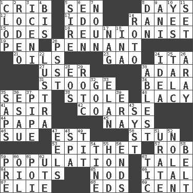 ACROSS 1. Baby bed with high sides 5. Elected rep. 8. 24-hour periods 12. Venues 13. Wedding promise 14. Indian princess (variant) 15. Lyric poems 16. One who advocates reunion 19. Animal enclosure 20. Pre-World Series prize 21. Petroleums 23. E Mali city 24. Call ___ day 27. One who uses or employs something 30. The sixth month of the Jewish calendar 31. Moe Howard, for one 34. Actor Lugosi 35. Back-to-school mo. 38. Took without asking 40. Made of lace 41. SW Saudi Arabia district 42. Rough 44. Dad 45. Negative votes 46. Institute legal proceedings 47. Eastern Standard Time (abbr.) 50. Surprise greatly 53. Curse 57. Director Reiner 59. Census information 63. Falsehood 64. Disturbances 65. Dreamland 66. Slanted text style (abbr.) 67. Writer Wiesel 68. Begley and Asner 69. Penny DOWN 1. Hoof sound 2. Cowboy competition 3. Ancient Celtic tribe of eastern Britain 4. Twice 5. Male parent of an animal 6. Locale of original sin 7. Part of speech 8. One of the 12 tribes of Israel 9. Cuckoo 10. Consenting reply 11. Arrange properly for use 14. Printing process, for short 17. Tired old horse 18. _ tizzy (2 wds.) 20. Inconspicuous attention getter 22. A period of five years 24. The main thing one is thinking about 25. Baby powder 26. Like ___ of sunshine 28. Greek goddess of the dawn 29. College mil. group 30. Most capable 32. Thick or sticky substance 33. Liveliness 35. Plant excrements 36. He sold his birthright 37. Corncob 39. Epoch 43. System (abbr.) 47. Snakelike fish 48. Health resort 49. Teat (slang) 51. A salt of uric acid 52. Pitcher Ryan 54. Prong on a fork 55. Parka part 56. Extremities 58. Waist strap 59. Before (prefix) 60. Petroleum 61. Luau course 62. Shoshoni 63. Nervous spasm