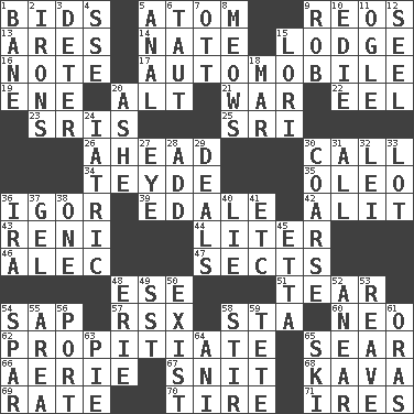 ACROSS 1. Auction offers 5. Tiny particle 9. Vintage cars 13. Ancient Greek god of war 14. Nathan's nickname 15. Cabin 16. Brief written record 17. Car 19. Compass dir. 20. The first octave above the treble staff 21. Armed conflict 22. Snakelike fish 23. Indian titles of respect 25. _ Lanka 26. Having the leading position 30. Give a ring to 34. Miss Universe 1986, Barbara Palacios _ 35. Butter sub 36. Russian composer Stravinsky 39. Peak District village in England 42. Set down 43. Painter Guido (1575-1642) 44. 61 cubic inches 46. Actor Baldwin 47. Religious groups 48. Compass dir. 51. Rend 54. Plant excrement 57. Acura sports coupe 58. R.R. building 60. Modern: prefix 62. Appease 65. Burn superficially 66. Nest on high 67. In a ____ (agitated or irritated) 68. Polynesian shrub of the pepper family 69. Pace 70. Become fatigued 71. Angers DOWN 1. Object of repulsion 2. Metal shackles 3. Prevent from occurring 4. Compass dir. 5. Of or related to the anus 6. Strained 7. Baseball player Mel 8. Catcalls? 9. Director Reiner 10. Singer Brickell 11. Stare at amorously 12. Stitch closed the eyes of (a falcon) 15. Australian parrot (variant) 18. Make imperfect 20. American tennis player Robert 24. Of or pertaining to medicine 27. Sight organ 28. Increase 29. Allots cards 30. Rough 31. 100% 32. Luau accessory 33. Car dealer's back yard 36. Retirement account (abbr.) 37. Set 38. Single 40. Whopper 41. And so on (abbr.) 45. Singer James 48. 4th largest of the Great Lakes 49. Fast jet (abbr.) 50. Have an existence 52. Approach 53. Break or tear apart 54. Coast Guard woman 55. Length times width 56. Sweet dark-red dessert wine 58. Use a swizzle stick 59. Wig 61. Mouths or openings 63. Sliced dessert 64. Cuckoo 65. What Jean-Claude Killy likes to do