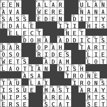 ACROSS 1. Car or cant ending 4. Having or resembling wings 8. Uhlan (variant) 12. Actress Gardner 13. We are 14. Grandmother 15. Backtalk 17. Paradise 18. Short, simple song 19. Peak District village in England 21. One more than two 23. Part of HMS, perhaps 24. Voters do this 26. Fish or hair follower 28. Capital of the state of Qatar 30. Inveterate users 34. Tavern 37. Brightly colored fish 39. Small pie 40. Bear (Spanish) 41. Amusement-park features 43. Falsehood 44. Soaks 46. First of billions? 47. Car dealer's back yard 48. Of or relating to Laos or its people 51. Food container 54. White ___ sheet 55. Marketplace scale 58. The 19th letter of the Greek alphabet 61. Not strict 63. Metal shackles 65. Come out of 67. Vertical spar for supporting sails 71. Like ___ of sunshine 72. Cuts off 73. Type of rug 74. Mountains (abbr.) 75. Celtic language 76. Jazz singing style 77. Arrange properly for use DOWN 1. Comfort 2. Elude 3. Relating to the nose 4. Deep reverence 5. Directed 6. "We ___ not amused" (Victoria) 7. Painter Guido (1575-1642) 8. Single; one (prefix) 9. Thin strip of wood or metal 10. Against 11. Negative votes 16. Downhill vehicle 18. Passed on 20. Environmental prefix 22. Working for oneself (abbr.) 25. Son of Odin 27. Teat (slang) 29. Bee-related 30. At or in the front 31. Give a ring to 32. Musical group of three 33. Proofreading order 34. Soup holder 35. At sea 36. Printing process, for short 38. Find the sum of 42. Stricken, poetically 45. R.R. building 49. Capri or Wight 50. Auto club (abbr.) 52. _ Lanka 53. Israeli folk dance 56. Typical standards 57. Maternal 58. Prong on a fork 59. SW Saudi Arabia district 60. United States Postal Service (abbr.) 62. Dec. holiday 64. System (abbr.) 66. Purpose 68. Curve 69. Ocean 70. Make lace