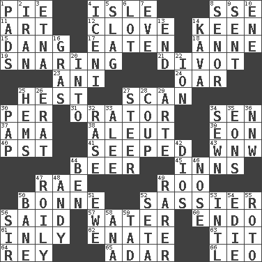 ACROSS 1. Sliced dessert 4. Small island 8. Compass dir. 11. Tate display 12. Garlic unit 14. Peachy ____! 15. Mild oath, euphamism for damn 17. Eroded 18. Singer Murray 19. Catching in a trap 21. A piece of turf (Scot.) 23. Black tropical American cuckoo 24. Rowing implement 25. Behest 27. Examine hastily 30. For each 31. Speaker 34. Elected rep. 37. Nursemaid (var.) 38. Native American of Southwest Alaska 39. Age 40. Pacific Standard Time (abbr.) 41. Oozed 43. Compass dir. 44. Fermented drink made from hops 45. Taverns 47. Actress Charlotte 49. Friend of Pooh 50. Child's nurse 52. More disrespectful 56. Expressed in words 57. Wetness 60. Inside; within (prefix) 61. Inwardly 62. Maternal 63. Teat (slang) 64. Marina Del _, California 65. The sixth month of the Jewish calendar 66. Lion DOWN 1. Groovy apts. 2. SW Asia republic 3. Inactive volcano in Sicily 4. Ancient Celtic tribe of eastern Britain 5. Volcanic refuse 6. Car dealer's back yard 7. First lady 8. Sir (Sp.) 9. Emitted 10. Compass dir. 13. Conclusion 14. Polynesian shrub of the pepper family 16. Pate de foie ____ 20. To the inside or interior of 22. Electrically charged atom 25. Folds over and sews together 26. Part of Q.E.F. 27. Navigate 28. Overturn; upset 29. Johnson of "Laugh-In" 30. Infant food 32. Raze (variant) 33. Toward shelter 34. Stitched 35. Immeasurably long periods of time 36. Compass dir. 42. "Vaya con ____" 44. Benjamin's nick name 46. Olfactory organ 47. Agitated, as a liquid 48. "60 Minutes" Commentator Rooney 49. More uncommon 50. Object of repulsion 51. She-sheep 52. Stalk of a moss capsule 53. International (abbr.) 54. Singer Brickell 55. Printing process, for short 56. Title for a knight 58. Santa ___, CA 59. Small amount or degree