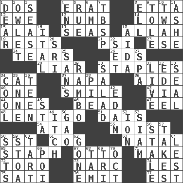 ACROSS 1. Two (Sp.) 4. Part of Q.E.F. 8. Singer James 12. She-sheep 13. Unfeeling 14. Coldest temperatures 15. Jai _ 17. Oceans 18. Assad's deity 19. Musical pauses 21. Air pressure measure (abbr.) 23. Compass dir. 24. Lacerates 26. Begley and Asner 28. One who doesn't tell the truth 30. Paper fasteners 34. Feline 37. California wine valley 39. Helper 40. Single 41. Grin 43. By way of 44. Singles 46. Necklace unit 47. Snakelike fish 48. Small, flat, pigmented spot on the skin 51. Raised platform 54. _ moment's notice (2 wds.) 55. Wet 58. Fast jet (abbr.) 61. Gear tooth 63. Brizilian seaport 65. Staphylococcus 67. Von Bismarck 71. Create 72. "Corrida" creature 73. Drug cop 74. French article 75. Suttee (variant) 76. Send forth 77. Eastern Standard Time (abbr.) DOWN 1. Letter starter 2. A small or young owl 3. Gospel singer Marvin 4. Followers of ems 5. Regret 6. Wet nurse (var.) 7. Cook's measure (abbr.) 8. Pipe bend 9. Lacquered or enameled metalware 10. It was, poetically 11. American tennis player Robert 16. Slanted text style (abbr.) 18. Opera by Verdi 20. _ Lanka 22. Arrange properly for use 25. Without 27. Health resort 29. Role for Stallone 30. Vegetable dish 31. Not recorded 32. Singer Brickell 33. Lick closed 34. Calm and collected 35. Queen of England 1702-14 36. Adolescent 38. Sliced dessert 42. Dutch treat 45. R.R. building 49. Hankering 50. E Mali city 52. Electrically charged atom 53. Thailand, formerly 56. Having lost freshness 57. Proceeds 58. Fast planes 59. Portico 60. Small pie 62. Went 64. For fear that 66. Luau course 68. Scottish cap 69. Three (prefix) 70. Sep. follower