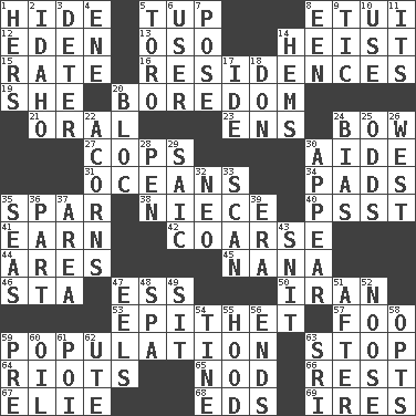 ACROSS 1. Flintstone garb 5. Uncastrated adult male sheep 8. Needle holder 12. Paradise 13. Bear (Spanish) 14. Robbery 15. Pace 16. Homes 19. A female animal or person 20. Mood resulting from idleness 21. Of the mouth 23. Followers of ems 24. Arrow shooter 27. 911 reaches them 30. Helper 31. Seas 34. Writing tablets 35. Coast Guard woman 38. Sibling's daughter 40. Inconspicuous attention getter 41. Merit 42. Unrefined 44. Ancient Greek god of war 45. Grandmother 46. R.R. building 47. Curvy letter 50. SW Asia republic 53. Curse 57. Egg _ yung 59. Census information 63. Constrict 64. Debaucheries 65. Dreamland 66. Repose 67. Writer Wiesel 68. Begley and Asner 69. Angers DOWN 1. Possessive pronoun 2. Potato state 3. Prevent from occurring 4. Compass dir. 5. "Corrida" creature 6. One who makes use of a thing 7. Airs 8. Car or cant ending 9. Nervous spasm 10. Purpose 11. ___ a Wonderful Life 14. Is hesitant and indecisive 17. Binary compound 18. Spanish title 20. Alliance 22. Oak nuts 24. Prejudice 25. Probability 26. Compass direction 28. Fenced enclosure 29. Ketch in the Levant 30. Seem 32. Modern: prefix 33. Glance over 35. Oceans 36. Piece 37. Length times width 39. Period 43. In a ____ (agitated or irritated) 47. Snakelike fish 48. Health resort 49. Be seated 51. Following 52. Trap for birds or small mammals 54. Prong on a fork 55. Parka part 56. Conclusions 58. Chooses 59. Before (prefix) 60. Lubricate 61. Luau course 62. Shoshoni 63. _ Lanka