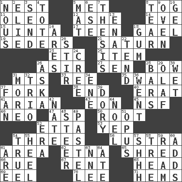 ACROSS 1. Egg locale 5. Was introduced to 8. Coat; cloak 11. Margarine 12. American tennis player Robert 14. Night before a holiday 15. National forest in Provo, Utah 17. Adolescent 18. Highlander 19. Spring feasts 21. Titan orbits this 23. And so on (abbr.) 25. Detail 26. SW Saudi Arabia district 27. Elected rep. 28. Arrow shooter 31. Mountains (abbr.) 33. To riddle 35. A sleeping potion; an opiate (poet.) 37. Tined utensil 38. Conclusion 40. Part of Q.E.F. 41. Believer in; advocate of (suffix) 43. A really long time 45. Science/research agcy. 46. Modern: prefix 47. Cleo's killer 50. Carrot, for example 52. Singer James 53. Slangy assent 54. Trios 56. A period of five years 61. Type of rug 62. Inactive volcano in Sicily 65. Tear up 66. Regret 67. Monthly bill 68. Froth on beer 69. Snakelike fish 70. Area sheltered from the wind 71. Equivocates DOWN 1. Horse sense 2. Writer Wiesel 3. Post 4. Carry 5. Floor protector 6. Compass dir. 7. College paper 8. Pull apart 9. Baking chamber 10. Set 13. Related on the mother's side 16. Ancient Greek god of war 18. Chewing product 20. Agitate 22. Look after 24. Algonquian 26. "____ silly question..." 28. Drinking establishments 29. Norwegian king 30. Dripping 31. Greater amount 32. Musical group of three 34. Compass dir. 36. Left 37. Air blower 39. Rowboat 42. Nathan's nickname 44. Christmas carol 48. Navigate 49. Soft color 51. Musical composition 52. Period 54. Loyal 55. Person who is morally reprehensible 57. Quiet! 58. Woody plant 59. 480, 500 or 516 sheets of paper 60. Sums up 61. "We ___ not amused" (Victoria) 63. Compass dir. 64. Had dinner