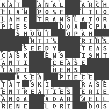 ACROSS 1. Krazy ___ of comics 4. Of or related to the anus 8. Bowlike part 12. Flair 14. Introduce or present, as a question 15. _ and Stitch 16. Unable to walk 17. Interpreter 20. Sliced desserts 21. ___ good deed 22. Tax preparer (abbr.) 23. Yell 27. Brightly colored fish 29. Nuclear Threat Initiatives 31. Teases 34. Sleazy 35. Afternoon social gatherings 36. Keg 39. Followers of ems 41. Is not 42. Against 43. Stop 46. Small pie 47. Coop moms 48. Toward the sea 51. Component 54. Make lace 56. What Jean-Claude Killy likes to do 58. To erase 61. Pleas 66. One of the Great Lakes 67. Small Philippine buffalo 68. The sixth month of the Jewish calendar 69. Not ill 70. French philosopher Descartes 71. Australian parrot (variant) 72. Two (Sp.) DOWN 1. Seaweed 2. Jai ____ 3. Softens 4. Fitting 5. And not 6. White ___ sheet 7. Grant temporary use of 8. In the manner of 9. Actors Guy, Robert Welles, and Clint 10. Hoof sound 11. Israeli folk dance 13. Soft 18. "Barney Miller" actor Jack 19. Infant locale 24. Single 25. Shoshoni 26. Periodic rise and fall of the sea level 28. Nick name for Arthur 30. Synchronize (abbr.) 32. Prohibit 33. Fast jet (abbr.) 34. Burlesque acts 36. Feline 37. Santa ___, CA 38. Ski resort town in Vermont 40. Ooze 44. Black tropical American cuckoo 45. Compass dir. 49. Compass dir. 50. Alias (abbr.) 52. Ship's personnel 53. Having ears or earlike features 54. Pull into pieces 55. Singer Murray 57. Slanted text style (abbr.) 59. Grain storage tower 60. Snakelike fish 62. Actress Charlotte 63. Wedding promise 64. Ewer handle 65. _ Lanka
