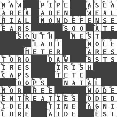 ACROSS 1. Informal term for the mouth 4. Corncob 8. Toward the sea 12. Type of rug 14. Arabian gulf 15. Welt 16. Monetary unit of Yemen 17. Unrelated to defense, as in spending 20. Hearing organs 21. "Barney Miller" actor Jack 22. Had dinner 23. _ pole 27. Egg locale 29. Tense 31. Undercover agent 34. Distance measurement 35. Ancient Greek god of war 36. "Corrida" creature 39. Fool 41. Fast planes 42. Angers 43. From or relating to Ireland 46. Smile enhancers 47. False hair 48. I made a mistake 51. Brizilian seaport 54. Or not 56. To sift 58. Connecting point 61. Pleas 66. Wrote a lyric poem 67. The main thing one is thinking about 68. Prong on a fork 69. Hindu god of fire 70. Old wives' tales, e.g. 71. Helper 72. Eastern Standard Time (abbr.) DOWN 1. Female horse 2. Roberta Peters solo 3. Puts on (as clothing) 4. Baking dish 5. Wedding promise 6. Writing instrument 7. Extremities 8. Deep reverence 9. Elected representatives 10. Compass direction 11. Toward shelter 13. In addition 18. A really long time 19. Enemy 24. Shoshoni 25. Make lace 26. Took on color 28. Box-office sellout 30. Distinguishing feature 32. Allow 33. Double-curved letter 34. With motion or animation 36. Nervous spasm 37. Mouth or opening 38. News announcer 40. Songbird 44. Call ___ day 45. Arrange properly for use 49. Before (prefix) 50. Ocean 52. Small Philippine buffalo 53. Cabin 54. Famous astronaut Armstrong 55. Southwest Nigerian state 57. Singer James 59. Habitations of wild animals 60. Prepare for publication 62. Actress Charlotte 63. One more than two 64. Conclude 65. Observe