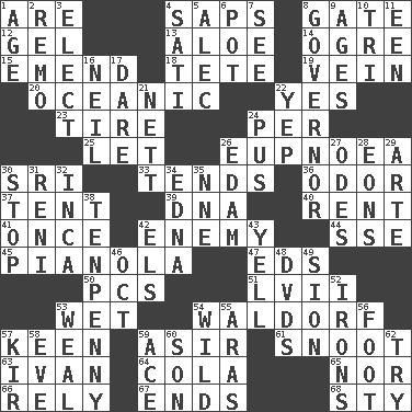 ACROSS 1. "We ___ not amused" (Victoria) 4. Plant excrements 8. Yard entry 12. Set 13. _ vera 14. Legendary monster 15. Make improvements or corrections to 18. False hair 19. Distinctive style or manner 20. Pertaining to the sea 22. Affirmative reply 23. Hoop that covers a wheel 24. For each 25. Allow 26. Normal relaxed breathing 30. Indian title of respect (Mr.) 33. Is inclined (to) 36. Aroma 37. Portable shelter 39. Heredity factor (abbr.) 40. Monthly bill 41. At one time in the past 42. Foe 44. Compass dir. 45. Player piano 47. Begley and Asner 50. Personal Computers (abbr.) 51. 57 in ancient Rome 53. Dripping 54. Apple salad 57. Peachy ____! 59. SW Saudi Arabia district 61. Snob 63. "Terrible" tsar 64. Root beer relative 65. And not 66. Have confidence or faith in 67. Conclusions 68. Filthy place DOWN 1. Mature 2. San ____ (Riviera town) 3. Choose 4. Suttee (variant) 5. Actor Baldwin 6. Cooking vessel 7. Perceive with the eye 8. State head 9. Eras 10. Three (prefix) 11. Car or cant ending 16. Famous astronaut Armstrong 17. Have the gumption 21. Remaining after all deductions 22. Slangy assent 24. Ichor 26. Dutch treat 27. Lyric poems 28. Immeasurably long periods of time 29. Johnson of "Laugh-In" 30. Obstruct or block passage 31. Painter Guido (1575-1642) 32. South American Indian 34. Pulitzer Prize-winning author Ferber 35. Compass dir. 38. 3-inch nail 42. Raised railways 43. Shout 46. Sep. follower 48. Movie discs 49. The Jewish people; Israel 52. Removes the wrinkles 53. Welt 54. Uncontrolled 55. Ancient river in northeast Turkey 56. Lowest support of a structure 57. Apertif with cassis 58. Night before a holiday 59. Adept person 60. Male offspring 62. Attempt