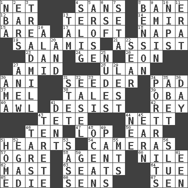 ACROSS 1. Fish or hair follower 4. Without 8. Object of repulsion 12. Soap unit 13. Laconic 14. Arab leader 15. Type of rug 17. High up in or into the air 18. California wine valley 19. Deli grouping 21. Aid 23. Daniel's nick name 24. Commissioned mil. rank 26. Period of immesurable duration 27. Among 28. ____ Bator 30. Cuckoo 31. Sowing specialist 34. Groovy apt. 37. Cartoonist voice _ Blanc 38. Stories 39. Chief or king in Benin or Nigeria 40. Leather borer 41. Cease 42. Marina Del _, California 43. Wig 44. Remaining after all deductions 46. "___ Little Indians" 47. Trim (branches) 50. Hearing organ 51. Centers of feelings and intuitions 54. Devices for capturing images 57. Legendary monster 58. Representative 60. The longest river in the world 62. Vertical spar for supporting sails 63. Theater features 64. Third day of the wk. 65. Singer Brickell 66. Elected reps. 67. Elected rep. DOWN 1. Basketball assoc. 2. Hearing organs 3. Excercise machine 4. Major League Baseball Commissioner Bud 5. Came up 6. Overdraft (abbr.) 7. Bristle 8. Gillaume's butler role 9. With great haste 10. Cuts off 11. Part of Q.E.F. 13. Scottish cap 16. Mountain range southwest of Kyrgyzstan 20. Plus 22. Scorch 25. Unclothed pictures 27. Afresh 29. For fear that 30. Housemaid (var.) 31. Proofreading order 32. Artist's stand 33. Connecticut Ivy Leaguer 34. Likenesses of persons 35. Collude with 36. 24 hours 41. Gouge 43. Cylindrical with tapered ends 44. Born 45. Merit 46. Tarsus (plural) 48. Sea 49. Leg coverings 51. Residence 52. Mild oath 53. Backtalk 55. Mountains (abbr.) 56. Change direction abruptly 59. Turn to the right 61. Car or cant ending