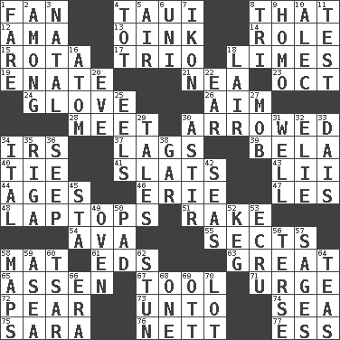 ACROSS 1. Avid follower 4. "Change" in Tahitian 8. Not this but _ 12. Housemaid (var.) 13. Pig sound 14. Hero or heavy, e.g. 15. Roll call or roster of names 17. Musical group of three 18. Citrus fruits 19. Related on the mother's side 21. Teachers' org. 23. Sep. follower 24. Michael Jackson trademark 26. Direct toward a target or goal 28. Rendezvous 30. Moved like an arrow 34. Big collection agency 37. Fails to keep up a pace 39. Actor Lugosi 40. Neckwear 41. Narrow boards 43. Cards in a Roman deck? 44. Matures 46. 4th largest of the Great Lakes 47. French article 48. Portable computers 51. Immoral or dissolute person 54. Actress Gardner 55. Religious groups 58. Floor protector 61. Begley and Asner 63. Relatively large 65. NE Netherlands city 67. Utensil 71. Goad 72. Lightbulb-shaped fruit 73. To (old English) 74. Ocean 75. "Two Mules for Sister ____" 76. Remaining after all deductions 77. Curvy letter DOWN 1. Conductor's collection 2. Amid 3. Relating to or accompanying birth 4. Small child 5. Atmosphere 6. University (slang) 7. Picture 8. Three (prefix) 9. Like (prefix) 10. Actor Baldwin 11. Trial 16. Smallest unit of an element 18. Den 20. First lady 22. Ewer handle 25. Snakelike fish 27. Disorderly crowd 29. Stories 30. Moving or stirring 31. Not ill 32. Writer Wiesel 33. Raised platform 34. Slanted text style (abbr.) 35. Port city in Latvia 36. Ooze 38. Slender fish 42. Oceans 45. R.R. building 49. Baking chamber 50. Writing tablet 52. Cask 53. Shade of tan 56. Laconic 57. Gurus 58. Atlas contents 59. Toward the sea 60. Russian ruler of old 62. Make senseless or dizzy 64. Afternoon social gatherings 66. Period 68. Single 69. Baseball player Mel 70. Car dealer's back yard