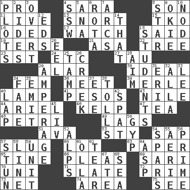 ACROSS 1. Adept person 4. "Two Mules for Sister ____" 8. Manchild 11. Moving, as bait 13. Derisive sound 15. Ring climax 16. Wrote a lyric poem 17. Observe 18. Stated 19. Laconic 21. White ___ sheet 22. Relationship diagram 23. Fast jet (abbr.) 24. And so on (abbr.) 27. The 19th letter of the Greek alphabet 29. Having or resembling wings 30. Standard of perfection 34. Opposite of masc. 36. Rendezvous 39. Haggard of country music 40. Desk light 41. Mexican monetary units 43. "Death on the ____" 44. Satellite of Uranus 46. Seaweed 47. Afternoon social gathering 48. _ dish (used to culture cells) 49. Falls behind 51. Actress Gardner 53. Filthy place 54. Plant excrement 57. Strike heavily 60. Car dealer's back yard 63. Some stationery 65. Prong on a fork 66. Entreaties 69. Indian skirt 70. Single; one (prefix) 71. Schedule 72. Demure 73. Fish or hair follower 74. Type of rug 75. Observe DOWN 1. Ground plans 2. Amusement-park features 3. Unconcealed 4. Compass dir. 5. Santa ___, CA 6. Roll call or roster of names 7. Arches 8. Play the lead 9. Migrant worker of the '30s 10. Thickened enlargement 12. Begley and Asner 14. Not this but _ 18. SAT takers 20. Snakelike fish 25. Pack (down) 26. Small stream 28. Direct toward a target or goal 29. Electrical Measurement 31. One of the Great Lakes 32. Silent film actress Nazimova 33. Area sheltered from the wind 34. Conductor's collection 35. Send forth 37. Compass dir. 38. For Whom the Bell _____ 40. Pet locale 42. Argument over a trivial matter 45. 54 in ancient Rome 50. Swindle 52. High mountains 54. Practice fights 55. Nest on high 56. A-one 57. Make senseless or dizzy 58. Actor's bit 59. A single undivided whole 61. Rounded earthenware pot or jar 62. Rend 64. Cleo's killer 67. Had dinner 68. Ocean