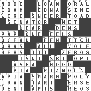 ACROSS 1. Connecting point 5. Rich soil 9. Spoken 13. Dutch treat 14. Pulitzer Prize-winning author Ferber 15. Trig term 16. We are 17. Scornful expression 18. Frog relative 19. Legislator 21. Was introduced to 22. Letter starter 23. Habitations of wild animals 24. Infant food 27. Single 28. Snakelike fish 29. Sea 31. Car or cant ending 32. Hankering 36. Mouths or openings 37. 100% 38. Grand slam 39. Possessive pronoun 40. One more than two 41. Nothings 42. Is not 44. _ Lanka 46. Choose 47. Toward the sea 48. Parka part 50. Parent Teacher Association (abbr.) 51. Player piano 54. Capital of Western Samoa 56. Excessive but superficial compliments 58. More than one (prefix) 60. SW Asia republic 61. Small pie 62. Celtic language 63. Scratch 64. Flats, for short 65. Vintage cars DOWN 1. ___ Haven, CT 2. Lyric poems 3. Have the gumption 4. Make improvements or corrections to 5. Poe poem 6. Baltic tributary 7. One (Scot) 8. Make imperfect 9. Clearly or manifestly demonstrative 10. Debaucheries 11. Santa ___, CA 12. Directed 17. Comedian Laurel of Laurel & Hardy 20. A really long time 21. Cartoonist voice _ Blanc 23. Lair 24. "Silly old bear" 25. Measure of real estate 26. Lightbulb-shaped fruit 28. Snakelike fish 30. Aide 31. Biblical high priest 33. "Corrida" creature 34. Hoof sound 35. Behest 37. Small island 40. _ tizzy (2 wds.) 41. The Jewish people; Israel 43. Ocean 44. Upper-body garments 45. Wander aimlessly 47. Bee-related 49. Drug addict 51. Role in a play 52. Old wives' tales, e.g. 53. In addition 54. Assist 55. Before (prefix) 56. R.R. building 57. Atlas unit 59. Consenting reply