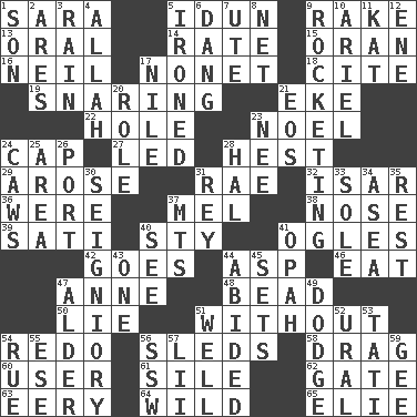 ACROSS 1. "Two Mules for Sister ____" 5. Goddess of spring and wife of Bragi 9. Libertine 13. Spoken 14. Pace 15. Northwest Algerian city 16. Famous astronaut Armstrong 17. Music written for nine 18. Quote 19. Catching in a trap 21. Supplement with great effort 22. Opening into or through something 23. Christmas carol 24. Head covering 27. Directed 28. Command 29. Came up 31. Actress Charlotte 32. Austrian river, tributary to the Danube 36. Past tense of be (plural) 37. Cartoonist voice _ Blanc 38. Characteristic smell of wine 39. Suttee (variant) 40. Filthy place 41. Stares 42. Moves 44. Cleo's killer 46. Erode 47. Queen of England 1702-14 48. Necklace unit 50. Whopper 51. Sans 54. Redecorate 56. Bobsleighs 58. To be drawn or hauled along 60. One who uses or employs something 61. Drop; flow; fall 62. Yard entry 63. Suggestive of the supernatural 64. Rampant 65. Writer Wiesel DOWN 1. Manchild 2. Ancient Greek god of war 3. Precipitation 4. Assad's deity 5. Pressed 6. Mild oath, euphamism for damn 7. Shoshoni 8. Fish or hair follower 9. Shooting up abruptly 10. Satellite of Uranus 11. Krazy ___ of comics 12. Compass dir. 17. Mediterranean tributary 20. Hero or heavy, e.g. 21. Greek goddess of the dawn 23. Born 24. Crow sounds 25. Length times width 26. Left side of a ship or aircraft 28. Actor Linden 30. Signiory (variant) 31. Marina Del _, California 33. Not divided or shared with others 34. At sea 35. Take ten 37. Mountains (abbr.) 40. Perceive with the eye 41. Brightly colored fish 43. Single 44. Tolerated 45. Puts into a specified state 47. Tree or shrub in the Birch family 49. Evade 51. Water source 52. Mountain range 53. Jacques of French films 54. Sorrow 55. Compass dir. 56. Compass dir. 57. Cards in a Roman deck? 59. Unit of force equal to gravity