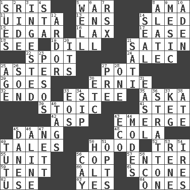 ACROSS 1. Indian titles of respect 5. Armed conflict 8. Nanny (var.) 11. National forest in Provo, Utah 13. Followers of ems 14. Downhill vehicle 15. _ Allan Poe 16. Not strict 17. Relaxation 18. Perceive with the eye 19. Deli pickle 21. Smooth fabric 22. Specific locale 24. Actor Baldwin 25. Michaelmas daisies 27. Plant holder 29. Travels 30. Bert's buddy 32. Inside; within (prefix) 33. First name in cosmetics 35. "____ silly question..." 39. Unemotional 41. Proofreading order 42. Cleo's killer 43. Develop 45. Mild oath, euphamism for damn 48. Root beer relative 49. Lies 50. Parka part 52. Three (prefix) 55. A single undivided whole 56. Police officer (slang) 57. Keyboard key 59. Portable shelter 60. The first octave above the treble staff 61. Biscuitlike quick bread 62. Purpose 63. It is so 64. Washington bills DOWN 1. Takes to court 2. Travel on or in a vehicle 3. Consumed 4. R.R. building 5. Not ill 6. Of or related to the anus 7. Acura sports coupe 8. Having winglike extensions 9. Of or pertaining to a meson 10. An important port of Yemen 12. Zeal 14. Lick closed 20. ___ a Wonderful Life 21. Suttee (variant) 23. Mexican monetary units 25. Ripen 26. Male offspring 27. Before (prefix) 28. Single 30. And so on (abbr.) 31. Artist's stand 33. Greek goddess of the dawn 34. Small drink 36. Ski resort town in Vermont 37. Cask 38. Had dinner 40. Labels 43. Environmental prefix 44. Methods 45. Natives or inhabitants of Denmark 46. Place in a line 47. Remaining after all deductions 49. Ballerina skirt 50. Hollow 51. Chooses 53. French philosopher Descartes 54. Angers 56. Island 58. Non-commissioned officer (abbr.)
