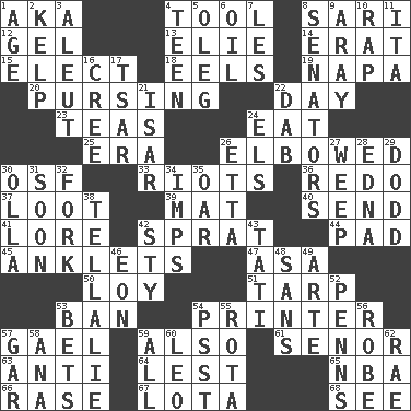ACROSS 1. Alias (abbr.) 4. Implement 8. Indian skirt 12. Set 13. Writer Wiesel 14. Part of Q.E.F. 15. Opt 18. Snakelike fish 19. California wine valley 20. Puckering 22. 24 hours 23. Beverages made from leaves 24. Erode 25. Epoch 26. Turned at an angle; bent 30. Order of Saint Francis (abbr.) 33. Disturbances 36. Do over again 37. Plunder 39. Floor protector 40. Transmit 41. Old wives' tales, e.g. 42. Small fatty European fish 44. Groovy apt. 45. Short socks 47. White ___ sheet 50. Myrna of the movies 51. Canvas cover 53. Forbid 54. Hard copy producer 57. Highlander 59. In addition 61. Sir (Sp.) 63. Opposed to 64. For fear that 65. Basketball assoc. 66. To erase 67. Globular water bottle used in Asia 68. Observe DOWN 1. Grow older 2. Seaweed 3. Native American of Southwest Alaska 4. Adolescent 5. Cassini of fashion 6. Lubricate 7. French article 8. Elected representatives 9. Like ___ of sunshine 10. Hit sharply and swiftly 11. Call ___ day 16. Algonquian 17. Russian ruler of old 21. Austrian river, tributary to the Danube 22. Apply (a substance) by light strokes 24. Raised railways 26. Singer James 27. Shed a tear 28. Pulitzer Prize-winning author Ferber 29. Texas town _ City 30. Rounded earthenware pot or jar 31. Within a short period 32. Tined utensil 34. Naughty children 35. Boat paddle 38. Copy Pinocchio 42. Filthy place 43. Jacques of French films 46. A really long time 48. Without 49. Johnson of "Laugh-In" 52. Actor Sean's family 53. Antes 54. Inconspicuous attention getter 55. Round or rotation of duties 56. Loose flowing garment 57. Slender fish 58. Santa ___, CA 59. 100% 60. Lion 62. Actress Charlotte