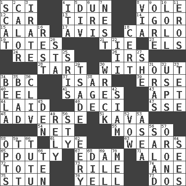 ACROSS 1. _-fi 4. Goddess of spring and wife of Bragi 8. Grand slam 12. Auto 13. Hoop that covers a wheel 14. Russian composer Stravinsky 15. Having or resembling wings 17. Advice 18. Monte _, Las Vegas Hotel/Casino 19. Lugs 21. Make a knot 23. Raised railways 24. Musical pauses 26. Big collection agency 28. Small pie 30. Sans 34. English channel? 37. Austrian river, tributary to the Danube 39. Celtic language 40. Snakelike fish 41. Gurus 43. Fitting 44. Put down 46. Tenth: prefix 47. Compass dir. 48. Contrary to your interests or welfare 51. Polynesian shrub of the pepper family 54. Fish or hair follower 55. With motion or animation 58. Baseball player Mel 61. Sodium hydroxide 63. Erodes 65. Inclined to pout 67. Dutch treat 71. _ vera 72. Carry 73. Cause heat under the collar 74. A saturated hydrocarbon 75. Surprise greatly 76. Shout 77. Two (Sp.) DOWN 1. Scram, to a cat 2. Bodily heat indicating an inflammation 3. Feeling or showing extreme anger 4. Call ___ day 5. HTML Container Element 6. RI univ. 7. A home for chicks 8. By way of 9. Legendary monster 10. Hang loosely or laxly 11. Greek god of love 16. State of inaction 18. Foregone conclusion 20. R.R. building 22. One more than two 25. Indian titles of respect 27. A female animal or person 29. Sadhe (variant) 30. Raze 31. Mouths or openings 32. United States Postal Service (abbr.) 33. Wig 34. Actor Lugosi 35. Necklace unit 36. 154 in Roman numerals 38. Mature 42. Thailand, formerly 45. Lair 49. Have confidence or faith in 50. Filthy place 52. Solemn pledge 53. At sea 56. Vegetable dish 57. U. of Maine site 58. Chooses 59. A blast of a horn 60. Ballerina skirt 62. Suggestive of the supernatural 64. Perceives with the eye 66. Nine, plus one 68. Expire 69. 100% 70. Cartoonist voice _ Blanc