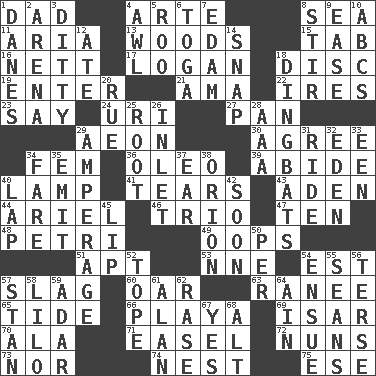 ACROSS 1. Male parent 4. Johnson of "Laugh-In" 8. Ocean 11. Roberta Peters solo 13. Forest 15. Bar bill 16. Remaining after all deductions 17. Utah city north of Ogden 18. Flat circle 19. Keyboard key 21. Housemaid (var.) 22. Angers 23. Declare 24. RI univ. 27. Baking dish 29. Age 30. Match 34. Opposite of masc. 36. Butter sub 39. Remain 40. Desk light 41. Pulls into pieces 43. Arabian gulf 44. Satellite of Uranus 46. Musical group of three 47. "___ Little Indians" 48. _ dish (used to culture cells) 49. I made a mistake 51. Fitting 53. Compass dir. 54. Eastern Standard Time (abbr.) 57. Volcanic refuse 60. Rowing implement 63. The wife of a rajah (variant) 65. Periodic rise and fall of the sea level 66. Beach, in Buenos Aires 69. Austrian river, tributary to the Danube 70. In the manner of 71. Artist's stand 72. Religious women 73. Or not 74. A home for chicks 75. Compass dir. DOWN 1. Natives or inhabitants of Denmark 2. Sports stadium 3. Simple song 4. Leather borer 5. Friend of Pooh 6. Ancient Roman robe 7. Dutch treat 8. Tumult 9. Relaxation 10. Lettered men learn these first 12. Had dinner 14. Fastener 18. Empty-headed or silly people 20. Sorrow 25. Carrot, for example 26. An arm off of a larger body of water 28. Auto club (abbr.) 29. Electrical Measurement 31. Travel on or in a vehicle 32. Locale of original sin 33. Car or cant ending 34. Conductor's collection 35. Send forth 37. Ewer handle 38. Greek mythologigal hunter 40. Infant locale 42. Within a short period 45. Mouth edge 50. For each 52. Drink excessively 54. Follow as a consequence or result 55. Actors Connery and Penn 56. Laconic 57. Comedian Laurel of Laurel & Hardy 58. _ and Stitch 59. The sixth month of the Jewish calendar 61. Actor Alda or Thicke 62. To erase 64. The 18th letter of the Arabic alphabet 67. Consenting reply 68. Keyboard modifier key