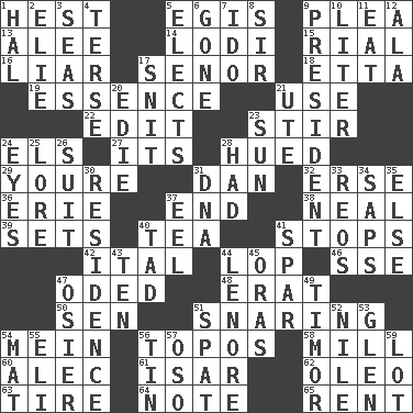 ACROSS 1. Command 5. Armor plate that protects the chest 9. Entreaty 13. Toward shelter 14. Farming town in central California 15. Monetary unit of Yemen 16. One who doesn't tell the truth 17. Sir (Sp.) 18. Singer James 19. Core 21. Purpose 22. Prepare for publication 23. Use a spoon 24. Raised railways 27. It is 28. Became colored 29. You are 31. One of the 12 tribes of Israel 32. Celtic language 36. One of the Great Lakes 37. Conclusion 38. Be tempered by heat 39. Arranges properly for use 40. Beverage made from leaves 41. Halts 42. Slanted text style (abbr.) 44. Chop off 46. Compass dir. 47. Wrote a lyric poem 48. Part of Q.E.F. 50. Elected rep. 51. Catching in a trap 54. Chow _ 56. Literary convention 58. Place where flour is made 60. Actor Baldwin 61. Austrian river, tributary to the Danube 62. Margarine 63. Hoop that covers a wheel 64. Musical sound 65. Monthly bill DOWN 1. Actor Linden 2. Writer Wiesel 3. Oceans 4. Laconic 5. Chooses 6. Went 7. Wedding promise 8. Title for a knight 9. Elected leader of a country 10. 61 cubic inches 11. Ingest 12. According to 17. In a ____ (agitated or irritated) 20. Singer Brickell 21. Shoshoni 23. Player for Phoenix 24. Sight organs 25. Old wives' tales, e.g. 26. Set or collection 28. Possessed 30. Dwelling 31. Heredity factor (abbr.) 33. Vintage cars 34. Plant excrements 35. Otherwise 37. Snakelike fish 40. Small boy 41. Practice fight 43. Nine, plus one 44. Poe poem 45. Mouths or openings 47. Flexible twig of a willow tree 49. The easternmost of the Lesser Sundas 51. Petty quarrel 52. "Death on the ____" 53. Small, secluded valley 54. Floor protector 55. Biblical high priest 56. Shallow baking pan 57. Bear (Spanish) 59. Car dealer's back yard