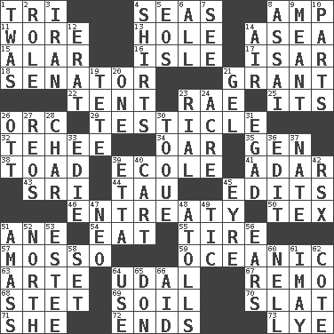 ACROSS 1. Three (prefix) 4. Oceans 8. Electrical Unit 11. Had on 13. Hollow 14. Toward the sea 15. Having or resembling wings 16. Capri or Wight 17. Austrian river, tributary to the Danube 18. Elected representative 21. Let have 22. Portable shelter 23. Actress Charlotte 25. ___ a Wonderful Life 26. The grampus (Milton) 29. One of the two male reproductive glands 32. Giggle 34. Rowing implement 35. Commissioned military rank (abbr.) 38. Frog relative 39. Learning spot: Fr. 41. The sixth month of the Jewish calendar 43. _ Lanka 44. The 19th letter of the Greek alphabet 45. Proofreads 46. Plea 50. John Ritter's dad 51. A saturated hydrocarbon 54. Consume 55. Hoop that covers a wheel 57. With motion or animation 59. Pertaining to the sea 63. Johnson of "Laugh-In" 64. Allodial 67. San ____ (Riviera town) 68. Proofreading order 69. Land 70. Narrow board 71. A female animal or person 72. Extremities 73. Potassium hydroxide DOWN 1. It was, poetically 2. Hero or heavy, e.g. 3. SW Asia republic 4. Chest coverings 5. Greek goddess of the dawn 6. 100% 7. Observe 8. Slender Brazilian palm 9. Intended 10. Actors' quests 12. Part of Q.E.F. 14. Atmosphere 19. Wig 20. Single 21. Set 23. Monetary unit of Yemen 24. 1/640 square mile 26. Baseball player Mel 27. Vintage cars 28. Burn to charcoal 30. Woman's close-fitting hat 31. Mild oath 33. Singer Brickell 36. Prepare for publication 37. Nathan's nickname 39. Singer James 40. Draw slowly or heavily 42. Acura sports coupe 45. Jane of fiction 47. Modern: prefix 48. Ringlike coral islands and reefs 49. Nervous spasm 51. Collect or gather 52. _ pole 53. First name in cosmetics 56. Hearing organs 58. Put into a specified state 60. 1994 drama film starring Jodie Foster 61. "If ____ say so..." 62. ____ d'Azur (French Riviera) 64. Purpose 65. Spanish title 66. Assist