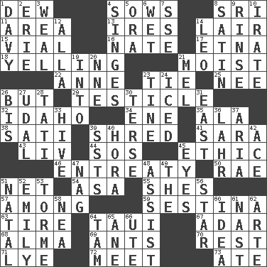 ACROSS 1. Morning condensation 4. Sty mamas 8. Indian title of respect (Mr.) 11. Length times width 13. Angers 14. Den 15. Small bottle 16. Nathan's nickname 17. Inactive volcano in Sicily 18. Crying or shouting loudly 21. Wet 22. Queen of England 1702-14 23. Make a knot 25. Born 26. With the exception that 29. One of the two male reproductive glands 32. Potato state 34. Compass dir. 35. In the manner of 38. Suttee (variant) 39. Fragment 41. "Two Mules for Sister ____" 43. 54 in ancient Rome 44. Mayday 45. Value system 46. Plea 50. Actress Charlotte 51. Fish or hair follower 54. White ___ sheet 55. "______ My Girl" (Turtles hit) 57. Amid 59. French poetic form 63. Become fatigued 64. "Change" in Tahitian 67. The sixth month of the Jewish calendar 68. _ mater 69. Pismires 70. Remainder 71. Potassium hydroxide 72. Rendezvous 73. Had dinner DOWN 1. _ Jones' Locker 2. 4th largest of the Great Lakes 3. Welt 4. Scorches 5. Mouth or opening 6. Dripping 7. Compass dir. 8. Smooth fabric 9. Wash lightly 10. Feeling or showing extreme anger 12. Silent film actress Nazimova 14. Lion 19. To the inside or interior of 20. Compass dir. 21. Cartoonist voice _ Blanc 23. Prong on a fork 24. On the rocks 26. Altar cloth linen 27. Allodial 28. Jacques of French films 30. Laconic 31. 90 degrees 33. Hub of activity 36. Cowardly lion portrayer 37. Roberta Peters solo 39. Fast planes 40. Israeli folk dance 42. Adept person 45. Snake ____ (dice throw) 47. Tired old horse 48. Help 49. Definite Article 51. Brizilian seaport 52. Poet Dickinson 53. Singer Mel 56. Play the lead 58. Teachers' org. 60. It may be bright or harebrained 61. Political cartoonist Thomas 62. Johnson of "Laugh-In" 64. Scottish cap 65. A saturated hydrocarbon 66. Shoshoni