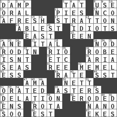 ACROSS 1. Moist 5. Make lace 8. Purpose 11. Relating to the mouth 12. Sliced desserts 13. Non-commissioned officer (abbr.) 14. Anew 17. Ski resort town in Vermont 19. Most capable 21. Foolish or stupid persons 22. Compass direction 23. Car or cant ending 24. One (Scot) 27. Slanted text style (abbr.) 29. Lower and raise head in agreement 32. "The Thinker" sculptor 34. _ de Janeiro 36. Loose flowing garment 37. Is not 38. And so on (abbr.) 39. Operatic vocal solo 40. Oceans 41. To sift 42. Klaipeda city 43. Curvy letter 44. Assign a rank or rating to 46. Fast jet (abbr.) 47. Nanny (var.) 50. Remaining after all deductions 52. Spoke pompously 55. Michaelmas daisies 57. Conveyance 59. Worn away 62. Followers of ems 63. Round or rotation of duties 64. Billionth: prefix 65. "Barney Miller" actor Jack 66. Eastern Standard Time (abbr.) 67. Makes supply last DOWN 1. ___ good deed 2. Sandy's bark 3. Hindu Mythology: god of death 4. Military trainee 5. Teat (slang) 6. Nest on high 7. Sadhe (variant) 8. To (old English) 9. Highlander 10. Immeasurably long periods of time 12. Pacific Standard Time (abbr.) 15. Killed 16. Command 18. Metal container 20. A viewer who gazes fixedly 24. Ascend 25. Olfactory organs 26. Ferber et al. 28. 61 cubic inches 29. Typical standards 30. Off-Broadway awards 31. Started a card game 33. ___ a Wonderful Life 35. Seas 36. Actress Charlotte 42. Distance measurement 45. Wig 47. _ moment's notice (2 wds.) 48. Distance measurement (Brit.) 49. Goodbye (Sp.) 51. Heavy duty weighing machine 52. Lyric poems 53. Western Nevada city 54. In addition 55. Santa ___, CA 56. Neighbor of Neb. 58. Baseball player Mel 60. Compass dir. 61. Two (Sp.)