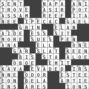 ACROSS 1. Transmitted 5. California wine valley 9. Cuckoo 12. Collection of objects 14. SW Saudi Arabia district 15. Plant holder 16. Indian state 17. Coral collection 18. Call ___ day 19. Born 20. Medicinal drug used to evoke vomiting 23. Highlander 24. Smile widely 25. Enthusiasm 27. Helper 30. Double-curved letter 32. Be seated 33. Greater amount 34. Institutes legal proceedings 36. Animal enclosure 38. Santa ___, CA 39. Pipe bend 40. Single 43. Slender fish 46. Narrow board 48. Peachy ____! 49. Twice 51. R.R. building 52. _ vera 53. Mitch Miller's instrument 54. Send forth 56. Polynesian shrub of the pepper family 58. Dodged 61. Big collection agency 64. Compass dir. 65. Aroma 66. First name in cosmetics 68. Age 69. Actor Lugosi 70. Nick name for Arthur 71. Followers of ems 72. Ancient Greek god of war 73. Charged atoms DOWN 1. Comedian Laurel of Laurel & Hardy 2. Celtic language 3. Olfactory organ 4. Federal power corp. 5. Drug cop 6. Toward the sea 7. Components 8. Sandy's bark 9. Bee-related 10. Brief written record 11. Slanted text style (abbr.) 13. Independent ruler or chieftain 21. Sliced desserts 22. Follows as a consequence or result 23. Yard entry 24. Unit of force equal to gravity 26. Mouth edge 27. Nanny (var.) 28. Electrically charged atom 29. To trail on the ground 31. Exchanges for money 35. Scheduled 37. Christmas carol 41. Modern: prefix 42. Compass dir. 44. Swedish rock group 45. River (Sp.) 47. Docile 48. Krazy ___ of comics 50. Sowing specialist 53. Baking chambers 55. It may be bright or harebrained 56. Leg joint 57. At once, immediately (arch.) 59. Short-tailed, large-bodied rat 60. Caspian sea tributary 61. "Tell ____ the Marines!" 62. It's straight from the horse's mouth 63. Observes 65. Chief or king in Benin or Nigeria 67. _ Lanka