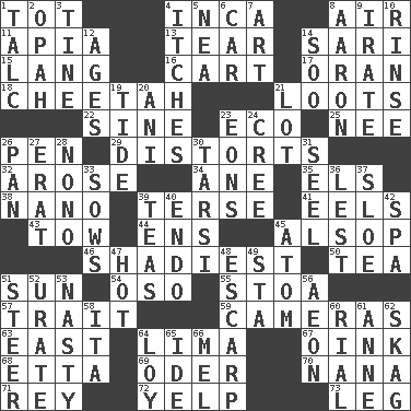 ACROSS 1. Small child 4. South American Indian 8. Atmosphere 11. Capital of Western Samoa 13. Separate forcefully 14. Indian skirt 15. Austrian-born American filmmaker Fritz 16. Haul 17. Northwest Algerian city 18. Leopard's kin 21. Plunders 22. Trig term 23. Environmental prefix 25. Born 26. Writing instrument 29. What propaganda does 32. Came up 34. One (Scot) 35. Raised railways 38. Billionth: prefix 39. Laconic 41. Snakelike fish 43. Pull behind 44. Followers of ems 45. Columnist Joseph or Stewart 46. Most dark, concealed or hidden 50. Afternoon social gathering 51. Player for Phoenix 54. Bear (Spanish) 55. Portico 57. Distinguishing feature 59. Devices for capturing images 63. Compass direction 64. Pale green bean 67. Pig sound 68. Singer James 69. Baltic tributary 70. Grandmother 71. Marina Del _, California 72. Sharp bark 73. Part of a journey DOWN 1. Baby powder 2. Brightly colored fish 3. Prong on a fork 4. Irritating cutaneous sensations 5. Teachers' org. 6. 4-wheeled motor vehicle 7. Nonscientific branch of learning 8. Composer Copland 9. Feeling or showing extreme anger 10. Remove soap 12. Eons 14. "Barney Miller" actor Jack 19. Periodic rise and fall of the sea level 20. Cuckoo 21. Car dealer's back yard 23. Immeasurably long periods of time 24. Algonquian 26. Baking dish 27. Part of Q.E.F. 28. Words to Nanette 30. Tarsus (plural) 31. Sew up the eyelids of hawks and falcons 33. Sty mamas 36. For fear that 37. A type of plum 39. Afternoon social gatherings 40. Inside; within (prefix) 42. Health resort 45. Tiny particle 47. Being at a high temperature 48. Fortification 49. R.R. building 51. Bull 52. A salt of uric acid 53. Thoroughly unpleasant 56. Age 58. Call ___ day 60. Monetary unit of Yemen 61. Queen of England 1702-14 62. Heroin 64. Myrna of the movies 65. Binary compound 66. Cartoonist voice _ Blanc