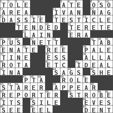 ACROSS 1. Lacquered or enameled metalware 5. Had dinner 8. Bear (Spanish) 11. Type of rug 12. "Terrible" tsar 13. Tired old horse 14. Hyrax 17. A testis 19. Watched over 21. Cylindrical with tapered ends 22. (Had) reclined 23. Period 24. Fluid product of inflammation 27. Remaining after all deductions 29. Bar bill 32. Maternal 34. To separate or throw off 36. Diluted with white 37. Prong on a fork 38. Curvy letter 39. Silent film actress Nazimova 40. Round or rotation of duties 41. And so on (abbr.) 42. Perfect 43. _ tizzy (2 wds.) 44. Droops 46. A female animal or person 47. Parent Teacher Assoc. 50. Hero or heavy, e.g. 52. A viewer who gazes fixedly 55. Seem 57. Newsperson 59. Disco prop 62. It is 63. Filth; sediment 64. Nights before holidays 65. Observe 66. Snakelike fish 67. Incision DOWN 1. Bit 2. Mouth or opening 3. For fear that 4. Artist's stand 5. "___ Maria" 6. Clothes sense 7. Keyboard key 8. Single time 9. Table seasoning 10. Double curve, resembling the letter S 12. It would 15. Empty; void 16. Singer Brickell 18. Lyricist Gershwin 20. Main course 24. _ dish (used to culture cells) 25. The state of being joined or united 26. Before Barbara or Clara 28. Trials 29. Stories 30. Assad's deity 31. Calif. Air Force Base 33. Afternoon social gathering 35. Fortification 36. Groovy apt. 42. Small island 45. Republicans 47. Adept person 48. Laconic 49. Nick name for Arthur 51. Having ears or earlike features 52. Indian titles of respect 53. False hair 54. Domed church section 55. "We ___ not amused" (Victoria) 56. Be footloose 58. Pipe bend 60. Benjamin's nick name 61. Eastern Standard Time (abbr.)