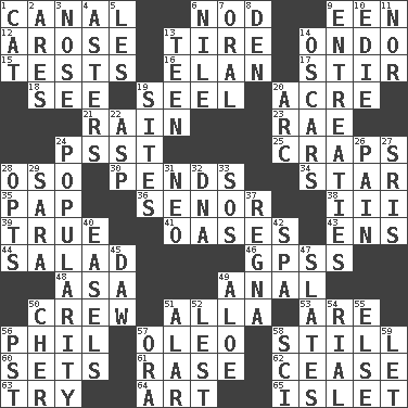 ACROSS 1. Lessep's creation 6. Dreamland 9. Car or cant ending 12. Came up 13. Become fatigued 14. Southwest Nigerian state 15. Trials 16. Enthusiasm 17. Move through with a circular motion 18. Observe 19. Sew up the eyelids of hawks and falcons 20. 1/640 square mile 21. Water falling in drops from the sky 23. Actress Charlotte 24. Inconspicuous attention getter 25. Dice game 28. Bear (Spanish) 30. Depends 34. Play the lead 35. Infant food 36. Sir (Sp.) 38. One more than two 39. Loyal 41. Fertile tracts in a desert 43. Followers of ems 44. Vegetable dish 46. Global Positioning Systems (abbr.) 48. White ___ sheet 49. Of or related to the anus 50. Ship's personnel 51. Silent film actress Nazimova 53. "We ___ not amused" (Victoria) 56. Silvers or Donahue 57. Margarine 58. Not moving 60. Arranges properly for use 61. Raze (variant) 62. Desist 63. Attempt 64. Nonscientific branch of learning 65. Small island DOWN 1. Feline 2. Ancient Greek god of war 3. Olfactory organ 4. Michaelmas daisies 5. French article 6. Mediterranean tributary 7. Relating to the mouth 8. Lair 9. Pleas 10. Singer Brickell 11. Or not 13. Adolescent 14. Motion picture awards 19. Settings 20. Curve 22. Cleo's killer 24. Teen's desire 26. Ache 27. Indian titles of respect 28. Chooses 29. "Two Mules for Sister ____" 31. Modern: prefix 32. Heredity factor (abbr.) 33. Mayday 37. Canadian anthropologist Darnell 40. Artist's stands 42. Health resort 45. Obsolete 47. Chalkboards 49. _ vera 50. "Mermaids" star 51. Having or resembling wings 52. For fear that 54. Monetary unit of Yemen 55. Otherwise 56. Pacific Standard Time (abbr.) 57. Mouth or opening 58. _-fi 59. Allow