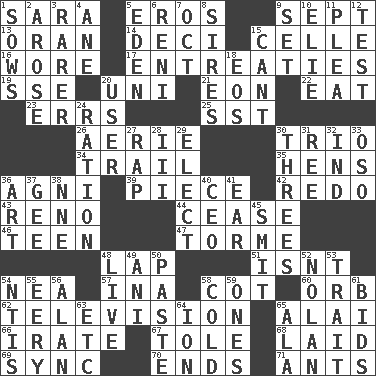 ACROSS 1. "Two Mules for Sister ____" 5. Greek god of love 9. Back-to-school mo. 13. NW Algerian seaport 14. Tenth: prefix 15. Cell (Danish) 16. Had on 17. Pleas 19. Compass dir. 20. University (slang) 21. A really long time 22. Ingest 23. Blunders 25. Fast jet (abbr.) 26. Nest on high 30. Musical group of three 34. Lag or linger behind 35. Coop moms 36. Hindu god of fire 39. Part 42. Do over again 43. Former U.S. Attorney General Janet 44. Stop 46. Adolescent 47. Singer Mel 48. Pet locale 51. Is not 54. Teachers' org. 57. _ tizzy (2 wds.) 58. Small bed 60. Globe 62. Boob tube 65. Mountain range southwest of Kyrgyzstan 66. Feeling or showing extreme anger 67. Lacquered or enameled metalware 68. Put down 69. Synchronize (abbr.) 70. Extremities 71. Pismires DOWN 1. Sty mamas 2. Came up 3. More valued for its uncommonness 4. A saturated hydrocarbon 5. Paradise 6. Painter Guido (1575-1642) 7. Sep. follower 8. Titles for men of rank and authority 9. Arrange properly for use 10. Writer Wiesel 11. Entreaty 12. Trial 15. Patter 18. Greek goddess of the dawn 20. One who makes use of a thing 24. Food allowance for one day 27. Reproach for some lapse or misdeed 28. One more than two 29. Choose 30. Triplets 31. To sift 32. Indiana (abbr.) 33. Bear (Spanish) 36. Nonscientific branch of learning 37. Turn to the right 38. Compass dir. 40. Corporate head (abbr.) 41. Ewer handle 45. Stricken, poetically 48. Not recorded 49. Cuckoo 50. Thick mixture 52. Pitcher Ryan 53. Distinguishing feature 54. Nuclear Threat Initiatives 55. Suggestive of the supernatural 56. Actor Alda or Thicke 58. Lacking warmth 59. Washington bills 61. Auction offers 63. And so on (abbr.) 64. Electrically charged atom 65. According to