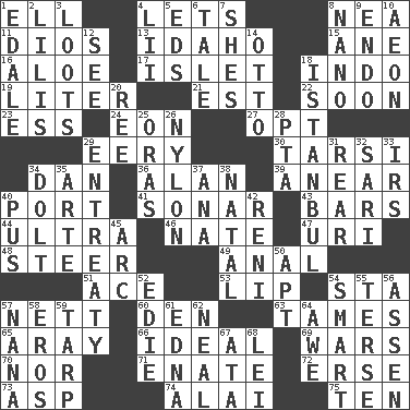 ACROSS 1. Pipe bend 4. Allows 8. Teachers' org. 11. "Vaya con ____" 13. Potato state 15. One (Scot) 16. Medicinal plant 17. Small island 18. _ china 19. 61 cubic inches 21. Eastern Standard Time (abbr.) 22. Within a short period 23. Curvy letter 24. Period of immesurable duration 27. Choose 29. Suggestive of the supernatural 30. Tarsus (plural) 34. Daniel's nick name 36. ____ Jay Lerner 39. Approach 40. Left side of a ship or aircraft 41. Echolocation 43. Soap units 44. Extreme 46. Nathan's nickname 47. RI univ. 48. Guide 49. Of or related to the anus 51. Adept person 53. Mouth edge 54. R.R. building 57. Remaining after all deductions 60. Lair 63. Domesticates 65. Like ___ of sunshine 66. Perfect 69. Armed conflicts 70. Not either 71. Related on the mother's side 72. Celtic language 73. Cleo's killer 74. Jai ____ 75. "___ Little Indians" DOWN 1. Peak District village in England 2. Ms. Damita and namesakes 3. Plunders 4. Cards in a Roman deck? 5. Begley and Asner 6. Falsehood 7. "______ My Girl" (Turtles hit) 8. Billionth: prefix 9. Inside; within (prefix) 10. Period of immesurable duration 12. Perceive with the eye 14. Von Bismarck 18. Byzantium, centuries later 20. Portuguese money of account (variant) 25. Mouths or openings 26. Thermoplastic polyamide 28. Parent Teacher Assoc. 29. Plea 31. Posterior 32. Indian skirt 33. Big collection agency 34. Dunce 35. Johnson of "Laugh-In" 37. Santa ___, CA 38. Brizilian seaport 40. Festering 42. Painter Guido (1575-1642) 45. Curve 50. Fitting 52. Singer Brickell 54. Don Adams' spy role 55. Laconic 56. NE Netherlands city 57. Grandmother 58. Greek god of love 59. Canvas cover 61. Pulitzer Prize-winning author Ferber 62. Anneal 64. Deep reverence 67. "One Day ___ Time" 68. Flowery wreath