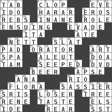 ACROSS 1. Keyboard key 4. Hoof sound 8. First lady 11. Wedding promise 12. Ethiopian city, capital of Harari 14. Greek god of love 15. Confederate soldiers (slang) 17. Empty; void 18. Hero or heavy, e.g. 19. Taking place subsequently 21. Dodge 23. Call ___ day 24. Had dinner 25. Remaining after all deductions 27. Narrow board 30. Groovy apt. 31. Speaker 34. Nonscientific branch of learning 37. Health resort 38. Eskimo relative 39. ___ good deed 40. Scottish cap 41. Oozed 43. Movie disc 44. Fermented drink made from hops 45. Domed church section 47. Santa ___, CA 49. River (Sp.) 50. Plants 52. More lively and spirited 56. Indian titles of respect 57. Failure 60. Woody plant 61. French philosopher Descartes 62. Clothes sense 63. Raised railways 64. Binary compound 65. Stern 66. Fast jet (abbr.) DOWN 1. Hoop that covers a wheel 2. An important port of Yemen 3. Moves up and down 4. Large country 5. Austrian-born American filmmaker Fritz 6. Mouth or opening 7. Baking dish 8. Wear away 9. Grand slam 10. Compass dir. 13. To riddle 14. Part of Q.E.F. 16. Set of matching outer garments 20. "Tell ____ the Marines!" 22. Large container 25. California wine valley 26. Dutch treat 27. Bull 28. Central Nebraska county 29. Johnson of "Laugh-In" 30. Pacific Standard Time (abbr.) 32. Raze (variant) 33. Toward shelter 34. Does sums 35. Be footloose 36. Bit 42. Raised platform 44. Tavern 46. Mail 47. Place in a line 48. Sense of smell 49. More valued for its uncommonness 50. Flintstone 51. The first octave above the treble staff 52. Stalk of a moss capsule 53. Angers 54. Snakelike fish 55. State of inaction 56. _ Lanka 58. Boat paddle 59. Compass dir.