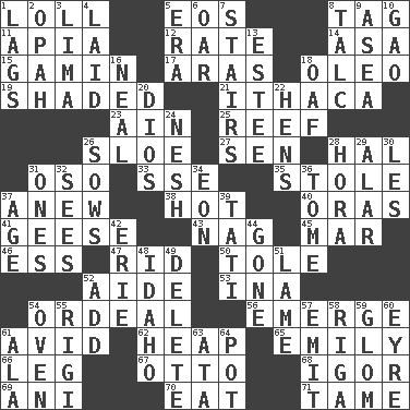ACROSS 1. Hang loosely or laxly 5. Greek goddess of the dawn 8. Label 11. Capital of Western Samoa 12. Pace 14. White ___ sheet 15. Homeless child 17. Ancient river in northeast Turkey 18. Butter sub 19. Cast a shadow over 21. New York city 23. The 18th letter of the Arabic alphabet 25. Coral ridge 26. A type of plum 27. Elected rep. 28. Actor Linden 31. Bear (Spanish) 33. Compass dir. 35. Took without asking 37. Afresh 38. Being at a high temperature 40. Mouths or openings 41. Honkers 43. Tired old horse 45. Spoil 46. Double-curved letter 47. To free from 50. Lacquered or enameled metalware 52. Assistant 53. _ tizzy (2 wds.) 54. Severe or trying experience 56. Develop 61. Enthusiastic 62. Pile 65. Poet Dickinson 66. Part of a journey 67. "Beetle Bailey" pooch 68. Composer Stravinsky 69. Cuckoo 70. Consume 71. Docile DOWN 1. Falls behind 2. Brightly colored fish 3. Pale green bean 4. Put down 5. Period 6. Rowing implement 7. Flight of steps 8. Baby powder 9. At sea 10. E Mali city 13. First name in cosmetics 16. Anneal 18. Clumsy lout 20. "Vaya con ____" 22. Coop moms 24. Delicate 26. Sty mamas 28. Israeli folk dance 29. Having or resembling wings 30. French article 31. Washington bills 32. Observes 34. A really long time 36. Heavy book 37. Grow older 39. Jacques of French films 42. One of the Great Lakes 44. Went 48. Potato state 49. Keyboard key 51. Unable to walk 52. Say or write further 54. Baking chamber 55. Swiss mountan, "Queen of the Mountains" 57. Give off 58. Capital of Latvia 59. Seize upon or latch onto something 60. Jane of fiction 61. According to 63. "One Day ___ Time" 64. Plant holder