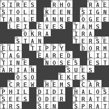 ACROSS 1. Fathers 6. 17th letter of the Greek alphabet 9. Actress Charlotte 12. Fur scarf 13. Peachy ____! 14. Omen 15. Eating place 16. Singer Murray 17. Double curve, resembling the letter S 18. Flowery wreath 19. Nights before holidays 20. Scottish caps 21. Gumbo ingredient 23. Retirement account (abbr.) 24. Comedian Laurel of Laurel & Hardy 25. Laconic 28. Connecticut Ivy Leaguer 30. Likely to tip or tilt 34. Dormintory (informal) 35. Label 36. Having ears or earlike features 38. Cards in a Roman deck? 39. Prong on a fork 41. Olfactory organs 43. Eastern Standard Time (abbr.) 44. Believer in; advocate of (suffix) 46. Takes to court 48. Bear (Spanish) 49. Makes supply last 50. Ship's personnel 51. Is hesitant and indecisive 53. Auto 56. Silvers or Donahue 57. "You Light Up My Life" star Conn 58. Rings 60. Perceives with the eye 61. Baltic tributary 62. Feeling or showing extreme anger 63. Big collection agency 64. Elected rep. 65. Small fatty European fish DOWN 1. Fast jet (abbr.) 2. Slanted text style (abbr.) 3. Loose flowing garment 4. American author Paul (1891-1958) 5. Observe 6. French philosopher Descartes 7. Coop moms 8. Single 9. Frustrating wastes of time 10. Grows older 11. Compass dir. 13. Polynesian shrub of the pepper family 14. Flew 19. Bert's buddy 20. Teat (slang) 22. Krazy ___ of comics 24. Seigniories (variant) 26. Indian titles of respect 27. Send forth 28. Singer James 29. Den 31. Baking dish 32. Adept person 33. Affirmative reply 37. Writing tables 40. Artist's stands 42. Take to court 45. Immediately 47. Fortification 49. Independent ruler or chieftain 50. "Mermaids" star 51. Flintstone garb 52. Paradise 54. Having or resembling wings 55. Round or rotation of duties 56. Air pressure measure (abbr.) 57. Two (Sp.) 58. Part of HMS, perhaps 59. Arrange properly for use