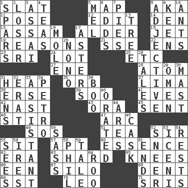 ACROSS 1. Narrow board 5. Atlas unit 8. Alias (abbr.) 11. Introduce or present, as a question 12. Prepare for publication 14. Lair 15. Indian state 17. Tree or shrub in the Birch family 18. Type of plane 19. Thinks logically 21. Compass dir. 22. Followers of ems 23. Indian title of respect (Mr.) 24. Car dealer's back yard 25. And so on (abbr.) 27. Compass dir. 28. Tiny particle 31. Pile 35. Globe 37. Pale green bean 38. Celtic language 39. "Barney Miller" actor Jack 41. Nights before holidays 42. Political cartoonist Thomas 43. Mouth or opening 45. Emitted 46. Tumult 47. Curve 49. Distress signal 51. Afternoon social gathering 52. Title for a knight 55. Be seated 57. Fitting 60. Core 62. Epoch 63. Pottery fragment 65. Leg joints 66. Car or cant ending 67. Grain storage tower 68. Incision 69. Fast jet (abbr.) 70. Lion 71. Indian titles of respect DOWN 1. Practice fights 2. Failure 3. Slender Brazilian palm 4. Afternoon social gatherings 5. Cartoonist voice _ Blanc 6. Does sums 7. Sliced desserts 8. Descriptive word 9. Peachy ____! 10. Pismires 13. Relationship diagram 16. Undercover agent 17. Michaelmas daisies 20. Words to Nanette 26. Stories 29. Sign of things to come 30. Vertical spar for supporting sails 31. Coop moms 32. Part of Q.E.F. 33. Aide 34. Stone: prefix 36. Surprise greeting 40. Spoke pompously 44. Ancient Greek god of war 48. Keg 50. Backtalk 52. Contemptuous expression 53. Ancient Celtic tribe of eastern Britain 54. Musical pauses 55. Observes 56. Angers 58. Silvers or Donahue 59. Story 61. Conclusions 64. Friend of Pooh