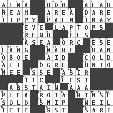 ACROSS 1. _ mater 5. Director Reiner 8. Having or resembling wings 12. 480, 500 or 516 sheets of paper 13. Length times width 15. Have the gumption 16. Likely to tip or tilt 18. Inside of hand 19. "If ____ say so..." 20. Night before a holiday 22. Portable computers 24. Tear apart 26. Raised railways 27. At sea 28. The grampus (Milton) 29. Compass dir. 32. Long (Scottish) 35. Female horse 37. Prohibit 38. Mitch Miller's instrument 39. Help 40. Chilled 41. Keyboard modifier key 42. Legendary monster 43. To (old English) 44. Born 45. Compass dir. 46. SW Saudi Arabia district 49. Nervous spasm 50. For fear that 51. Refrain by choice 55. American Automobile Association (abbr.) 56. Entreaty 57. Round or rotation of duties 59. Wash lightly 63. Disposed of to a purchaser 64. Clip 65. Famous astronaut Armstrong 66. Wig 67. Fast jet (abbr.) 68. Indian skirt DOWN 1. Tate display 2. Luau accessory 3. Atlas unit 4. Electrical Measurement 5. Reproach for some lapse or misdeed 6. Of the mouth 7. Actor Lugosi 8. Goodbye (Sp.) 9. Desk light 10. Caspian sea tributary 11. Marina Del _, California 14. Electrical Unit 17. Jacques Cousteau's middle name 21. Compass dir. 23. Affectionate concern, for short 25. Break 28. Severe or trying experience 29. Inky black, to poets 30. Table seasoning 31. Inside; within (prefix) 32. Grant temporary use of 33. Competent 34. Musical sound 36. Atmosphere 40. Window treatments 42. Motion picture awards 45. Be seated 47. Ocean 48. Austrian river, tributary to the Danube 49. Sadhe (variant) 51. Medicinal plant 52. Waist strap 53. Charged atoms 54. Nuclear Threat Initiatives 56. Pacific Standard Time (abbr.) 58. Fitting 60. Teachers' org. 61. Title for a knight 62. Connecticut Ivy Leaguer