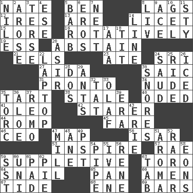 ACROSS 1. Nathan's nickname 5. Benjamin's nick name 8. Falls behind 12. Angers 13. "We ___ not amused" (Victoria) 14. It is permitted: Lat. 15. Old wives' tales, e.g. 16. Rotating or pertaining to rotation 19. Curvy letter 20. Refrain by choice 21. Snakelike fish 23. Had dinner 24. _ Lanka 27. Opera by Verdi 30. Ketch in the Levant 31. Right away 34. Naked 35. Small pie 38. Having lost freshness 40. Wrote a lyric poem 41. Margarine 42. A viewer who gazes fixedly 44. Frolic 45. Conductor's collection 46. Corporate head (abbr.) 47. Atlas unit 50. Austrian river, tributary to the Danube 53. Stimulate to action 57. Actress Charlotte 59. Supplementary 63. "Corrida" creature 64. Slow-paced one 65. Baking dish 66. So be it 67. Event that recurs at intervals 68. Compass dir. 69. Oblong pieces of solid material DOWN 1. The longest river in the world 2. Came up 3. Laconic 4. Compass dir. 5. Sharp remark 6. Greek god of love 7. Remaining after all deductions 8. 54 in ancient Rome 9. Adept person 10. Set 11. Filthy place 14. Actor's bit 17. American Automobile Association (abbr.) 18. Teat (slang) 20. SW Saudi Arabia district 22. Portable computer 24. Saudi Arabian king (1953-1964) 25. Travel on or in a vehicle 26. On the rocks 28. Two (Sp.) 29. Pismires 30. Sounds asleep 32. Make lace 33. Norwegian king 35. Torque (variant) 36. Medicinal plant 37. San ____ (Riviera town) 39. Period 43. 4th largest of the Great Lakes 47. Place where flour is made 48. One (Scot) 49. Pacific Standard Time (abbr.) 51. Scent 52. More uncommon 54. Corncob 55. "Terrible" tsar 56. French philosopher Descartes 58. Immeasurably long periods of time 59. Fast jet (abbr.) 60. Corn or form start 61. Writing tablet 62. Sliced dessert 63. Bar bill