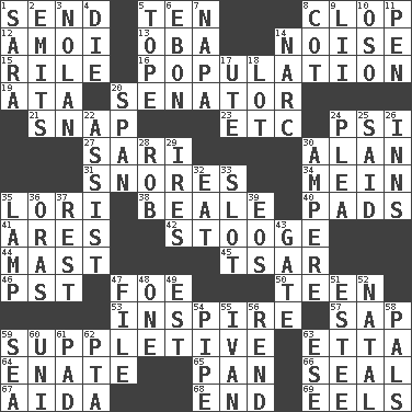 ACROSS 1. Post 5. "___ Little Indians" 8. Hoof sound 12. Mine, in Marseilles 13. Chief or king in Benin or Nigeria 14. Annoying sound 15. Cause heat under the collar 16. Census information 19. _ moment's notice (2 wds.) 20. Elected representative 21. Fastener 23. And so on (abbr.) 24. Air pressure measure (abbr.) 27. Indian skirt 30. Actor Alda or Thicke 31. Sounds asleep 34. Chow _ 35. Australian parrot (variant) 38. Calif. Air Force Base 40. Writing tablets 41. Ancient Greek god of war 42. Moe Howard, for one 44. Vertical spar for supporting sails 45. Russian ruler of old 46. Pacific Standard Time (abbr.) 47. Enemy 50. Adolescent 53. Heighten or intensify 57. Plant excrement 59. Supplementary 63. Singer James 64. Maternal 65. Baking dish 66. Lick closed 67. Opera by Verdi 68. Conclude 69. Snakelike fish DOWN 1. "Two Mules for Sister ____" 2. Sends forth 3. Pitcher Ryan 4. Pass on 5. Drink excessively 6. Inky black, to poets 7. California wine valley 8. Small bed 9. Cards in a Roman deck? 10. Bear (Spanish) 11. Fenced enclosure 14. Drug cop 17. Shoshoni 18. Car dealer's back yard 20. Connect, as a bridge 22. Help 24. Entreaty 25. Alleged 26. Restaurants 28. Director Reiner 29. Angers 30. Electrical Unit 32. Consume 33. Groove 35. Desk light 36. Mouths or openings 37. Relief 39. Greek goddess of the dawn 43. Yard entry 47. Do some clerical work 48. Single 49. Eastern Standard Time (abbr.) 51. First name in cosmetics 52. Relating to or accompanying birth 54. Corncob 55. _ the terrible 56. Tear apart 58. Friends 59. Ocean 60. Corn or form start 61. Groovy apt. 62. Parent Teacher Assoc. 63. Compass dir.