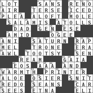 ACROSS 1. Car dealer's back yard 4. Without 8. Western Nevada city 12. Atmosphere 13. Laconic 14. On the rocks 15. Entreaty 17. Upward 18. Undercover agent 19. Deli grouping 21. Ringlike coral islands and reefs 23. Male parent 24. Commissioned military rank (abbr.) 26. Compass dir. 27. Among 28. Double curve, resembling the letter S 30. Black tropical American cuckoo 31. Titan orbits this 34. Hit sharply and swiftly 37. Cartoonist voice _ Blanc 38. Marketplace scale 39. Epoch 40. Leather borer 41. Tootsie (variant) 42. Elected rep. 43. 480, 500 or 516 sheets of paper 44. Greek goddess of the earth (variant) 46. Greek goddess of the dawn 47. American Automobile Association (abbr.) 50. Plus 51. Heat 54. Hard copy producer 57. Medicinal plant 58. Flexible twig of a willow tree 60. In a ____ (agitated or irritated) 62. Make new 63. Actors Connery and Penn 64. 4-wheeled motor vehicle 65. Perceives with the eye 66. Inactive volcano in Sicily 67. Biblical high priest DOWN 1. Infant locale 2. Petroleums 3. Excercise machine 4. Major League Baseball Commissioner Bud 5. Came up 6. Overdraft (abbr.) 7. Bristle 8. Full of chinks, cracks, or crevices 9. Learning spot: Fr. 10. 1994 drama film starring Jodie Foster 11. Lyric poems 13. Scottish cap 16. Mountain range southwest of Kyrgyzstan 20. Say or write further 22. Adolescent 25. Parts of speech 27. Afresh 29. Jennifer or Joel 30. Nursemaid (var.) 31. Portico 32. Scent 33. Small child 34. Dwelling 35. Length times width 36. Baking dish 41. Trial 43. Lover boys 44. Separate the seeds from cotton 45. Pismires 46. Eat (away) 48. Bee-related 49. Sports stadium 51. Armed conflicts 52. Toward shelter 53. Flexible conduit 55. Big collection agency 56. Monetary unit of Yemen 59. Put into a specified state 61. Three (prefix)